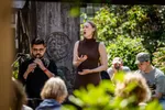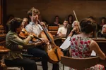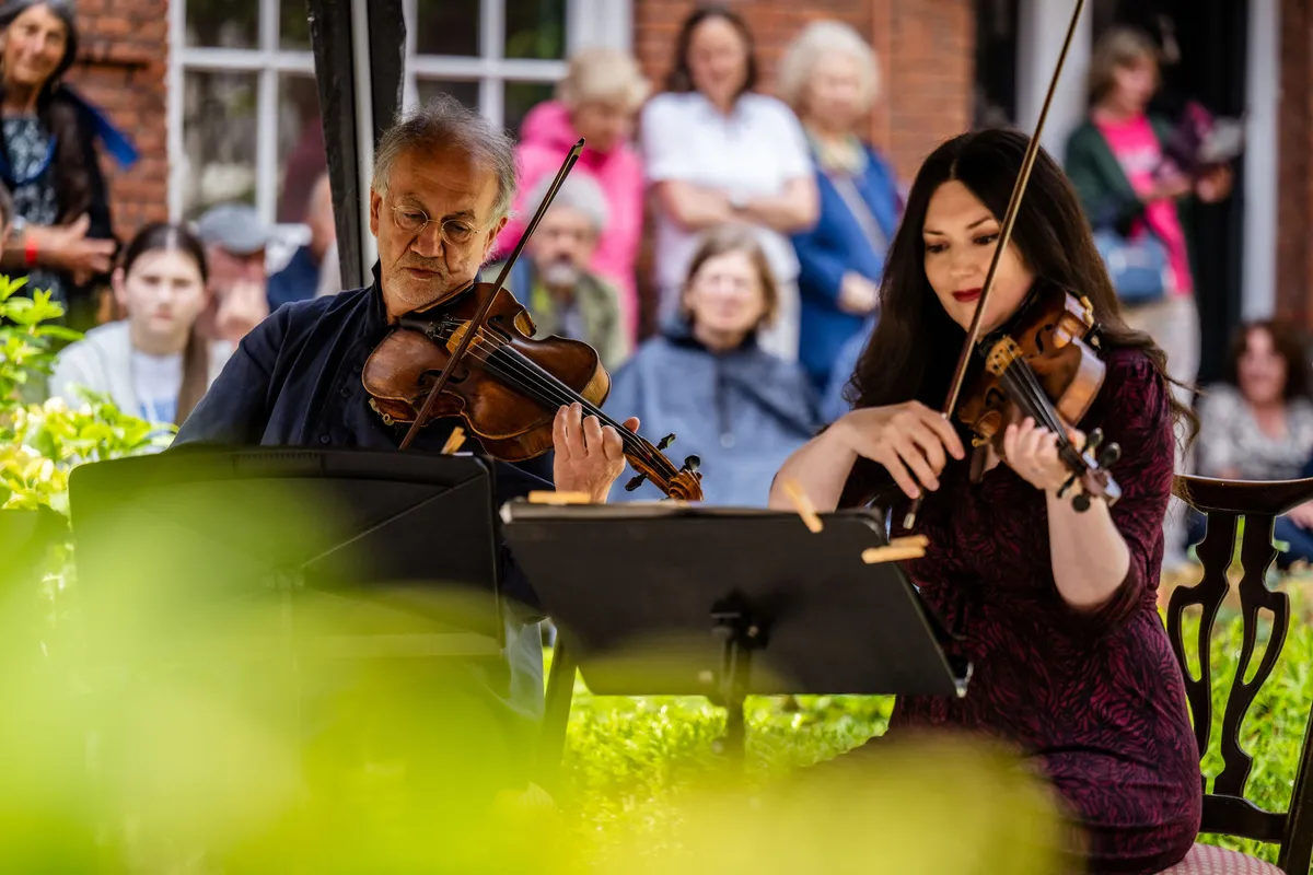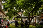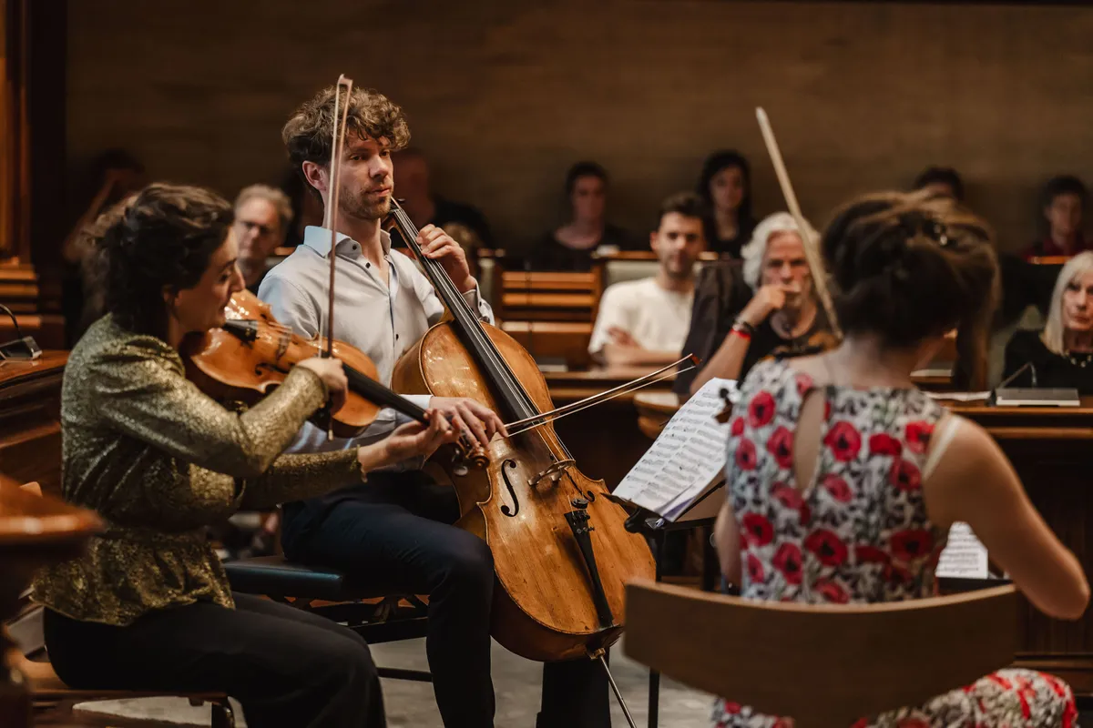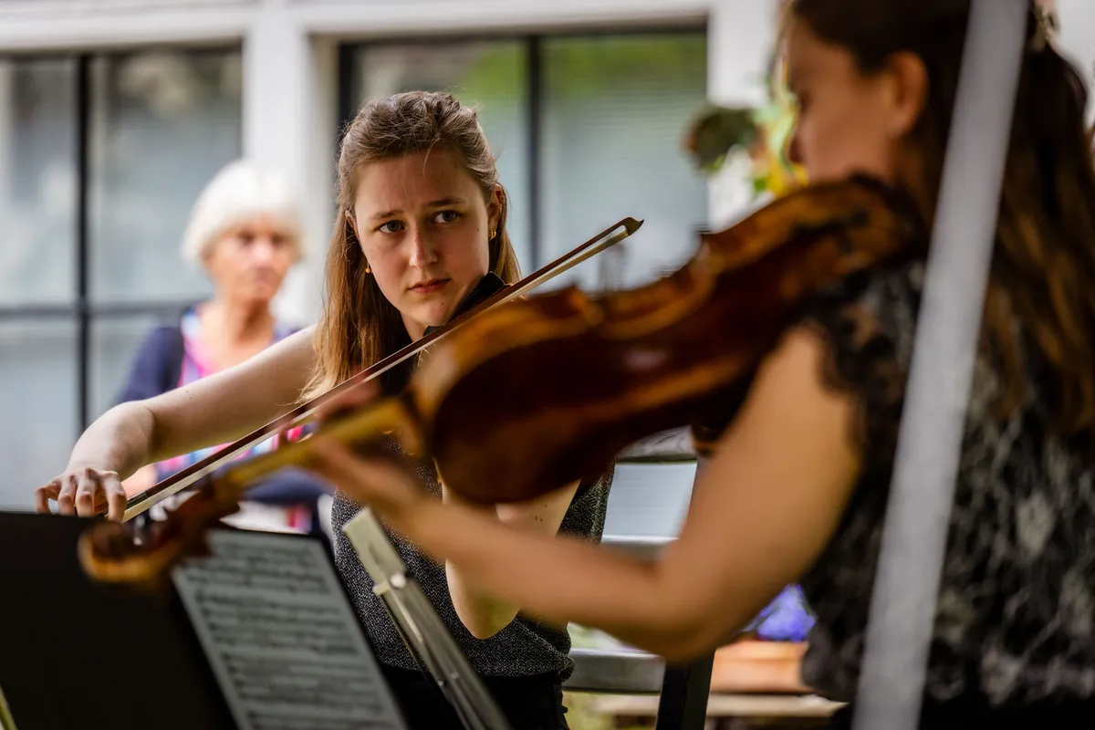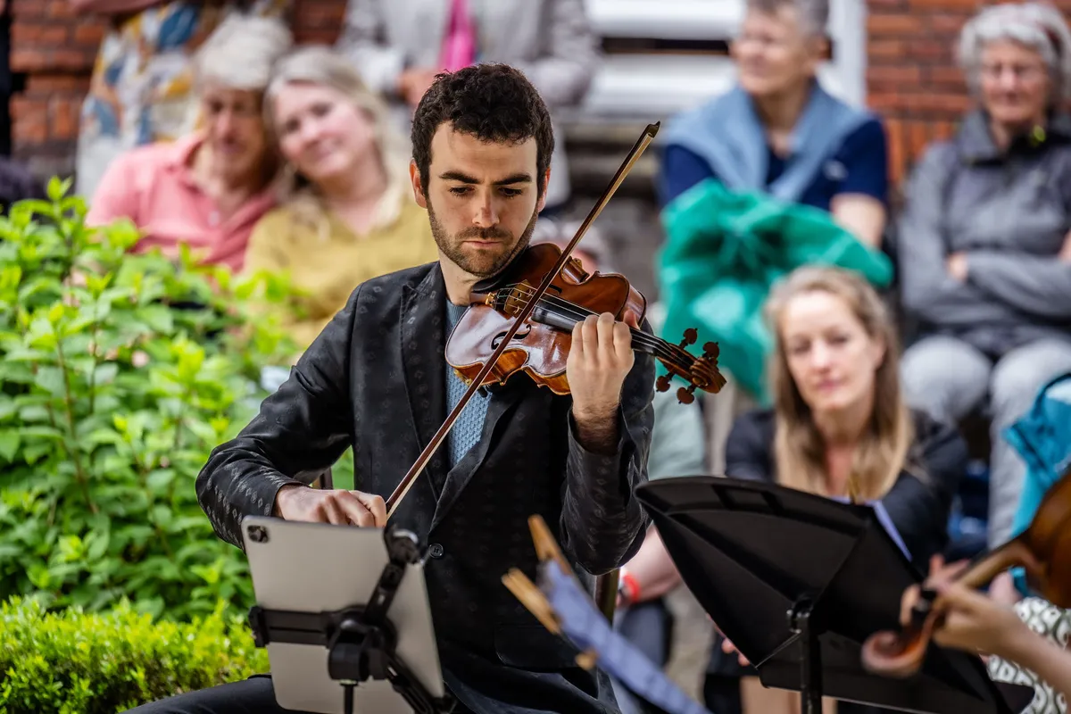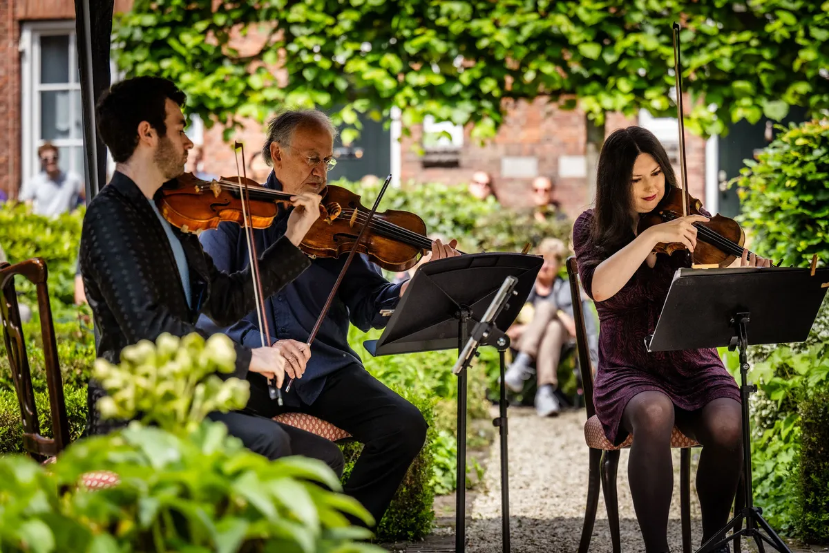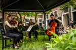 Het Groot Sionshof is deze zondag de enscenering voor het Viride Kwartet, dat bij binnenkomst in classicistische stijl lijkt te spelen. Het hofje zit en staat vol met geïnteresseerden en omwonenden, die het er lekker van nemen en nog eens extra genieten met goed gevulde glazen spritz. De diepte van de cello resoneert door het gehele hof, met een bed van violen erboven. Het deel dat ze uit een kwartet van Willem Pijper spelen, weet iedereen in het hof compleet stil te krijgen. De enige die zo brutaal is, en blijkbaar niet begeesterd genoeg, om geluid te maken, is een vogel die in dezelfde toonsoort een snippet van de vioolmelodie lijkt te herhalen. De altviool meandert, de cello kriebelt als een murmelende tor. Wanneer het thema terugkomt in beide partijen, voelt het als het hoogtepunt in het bloedstollend mooie kwartet. De kussens onder de spelers knappen bijna uit hun strikjes door het intense gestrijk. In elk gekozen stuk dat het Viride Kwartet speelt, weten ze het publiek in vertwijfeling en op scherp te zetten, door zogenaamde applausmomenten in climax en verstilling te brengen.