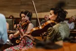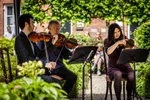 Onder het mom dat de keuze reuze is, met maar liefst achttien verschillende plekken om te kunnen bezoeken op de zondag, moet er een combinatie plaatsvinden tussen keiharde keuzes en soms wat bonnefooi-bezoeken. Een knoop die snel was doorgehakt, was die om het strijktrio van het Koninklijk Concertgebouworkest te gaan beluisteren, die toezegden een strijktrio van Beethoven (Opus 9, no. 1) te spelen. Vorig jaar speelde een viertal met Elise Besemer als aanvoerder een kwartet van Anton Arenski in de Burger-/ Trouwzaal van het Stadhuis, maar gelukkig mochten ze dit jaar plaatsnemen in de akoestisch aantrekkelijkere Raadzaal. Al bij het stemmen van de snaren, een ruimte verderop, veren nieuwsgierige luisteraars als stokstaartjes op. Voordat we ons kunnen verlekkeren aan Beethoven, trakteert het trio ons eerst nog op deel uit een strijktrio van Schubert.