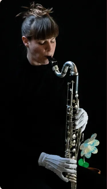 Basklarinettist Anna voor de Wind is, op witte handschoenen na, geheel in het zwart gekleed. Ze neemt plaats voor een zwart doek. Op het scherm achter haar zien wij een projectie van alleen haar handen en de prachtige basklarinet: een complex instrument met een imponerende hoeveelheid kleppen.