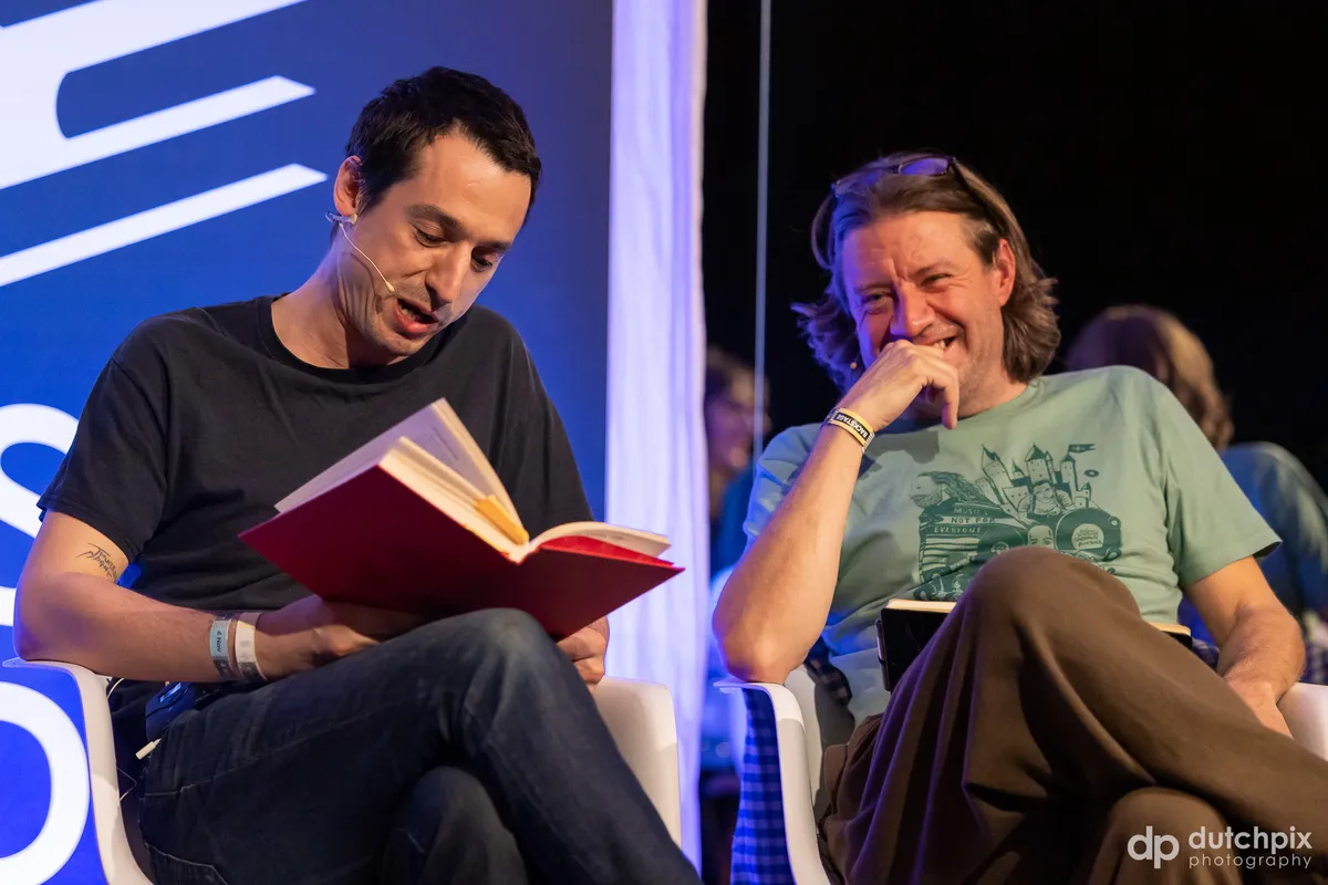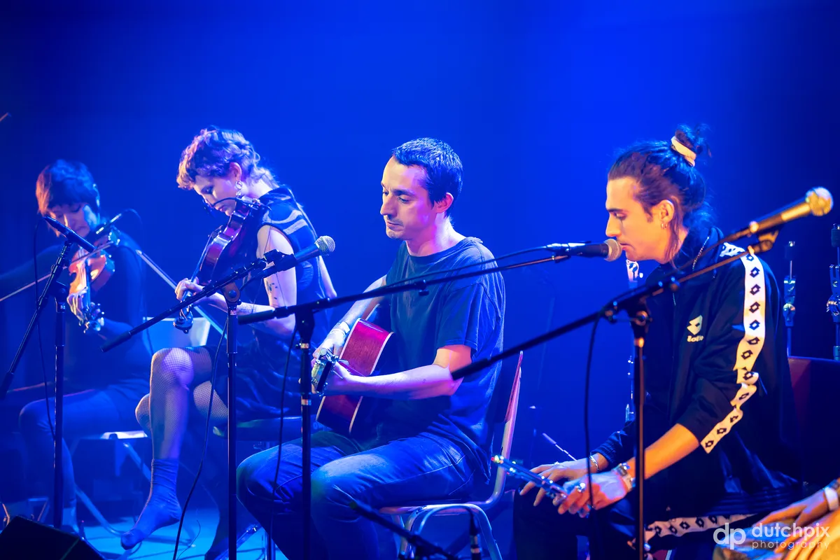 We wisselen het muzikale programma af met een interview. In Heartbeat Hotel vertelt Bez namelijk over zijn nieuwe boek, 'Buzzin''. Bez, echte naam Mark Berry, zou je kunnen kennen van The Happy Mondays, waar hij tijdens optredens extreem stoned zijn maracas schudde en op geheel eigen wijze danste. Of het zijn danstalent of zijn drugsgebruik is dat legendarisch is, laten we in het midden, maar we vermoeden in ieder geval dat hij zijn verhaal niet helemaal zelf op papier heeft gezet. Dat wordt bevestigd doordat hij met zijn ghostwriter, die wat hij zegt af en toe vertaalt en hem herinnert wat de vraag ook alweer was, op het podium zit. “Hozzie betekent hospital”. Bez zit vol verhalen, het ene nog verbazingwekkender dan het ander, en hij vertelt ze op smakelijke wijze. Bijna doodervaringen, hallucinaties, drugs en bijen houden komen allemaal op hilarische wijze voorbij. Meer weten? Lees het boek. Die dikke pil gaan we hier niet uitschrijven.