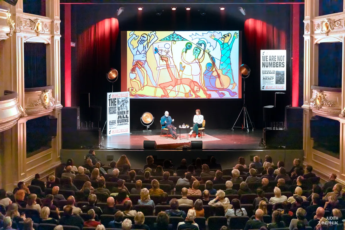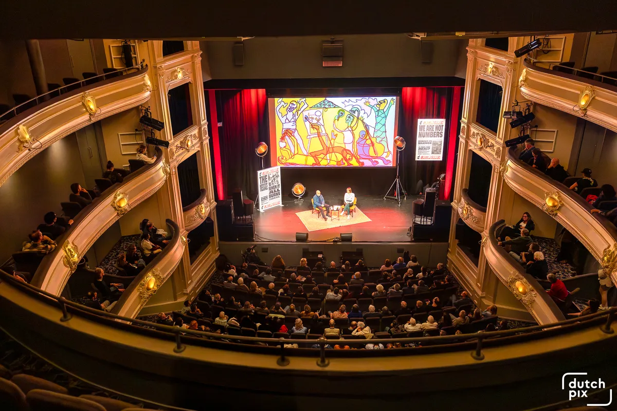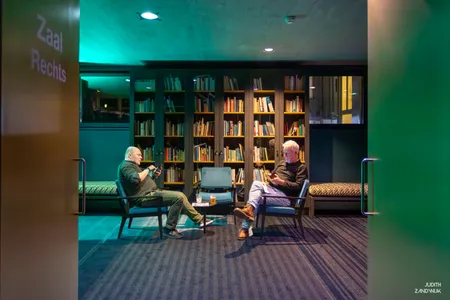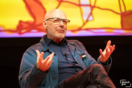 In The Raven buigen Brian Eno en Bette A. zich samen met een volle zaal over de vraag der vragen: waarom hebben we kunst nodig? In het publiek veel Haagse muzikanten, voor wie Eno’s vijf decennia aan muzikale carriere heilig erfgoed zijn. De man werkte met Roxy Music, Talking Heads, Bowie, Byrne, U2 en Grace Jones, maar is net zo goed beeldend kunstenaar en activist. Bette A., schrijver en kunstenaar, leidt het gesprek met een vleugje humor en precisie.