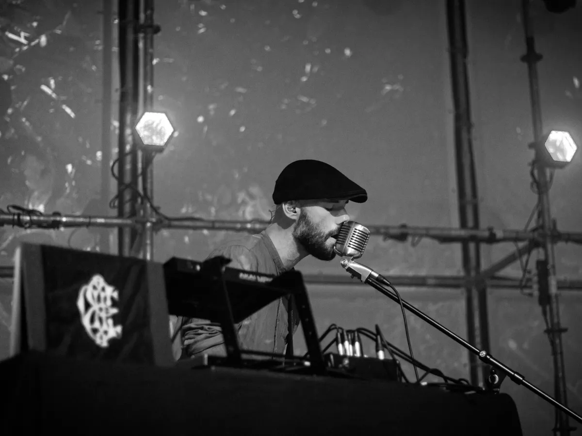 David komt op en de menigte klapt en joelt hem bescheiden toe – waarschijnlijk door de warmte. Op zijn eigen manier staat David op het podium, met zijn semi-akoestische Spaanse gitaar en typische jaren-50 microfoon. De eerste noten klinken rustig en zachtjes door de speakers en gelijk worden we meegenomen op een kosmische reis. Het maakt niet uit waar we naartoe gaan, want bij deze muziek gaat het duidelijk niet om de bestemming, maar om de reis. Langzaam stijgen we op en worden we meegevoerd. Zijn compagnon staat achter twee tafels met apparatuur. Ook houdt hij een basgitaar vast, welke hij bestrijkt als een viool. Iets dat een bijzonder mooi geluid creëert. David loopt als onze gids over het podium. Hij visualiseert hoe de reis door zijn muziek verloopt, versterkt met handgebaren. ‘’Make it rain’’ zingt hij op een gegeven moment. Nou, even wat verkoeling zou van harte welkom zijn!