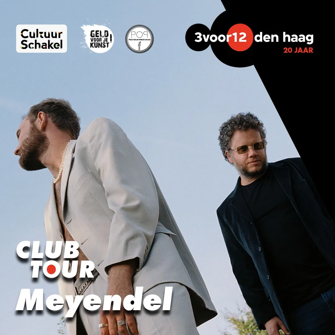 De 3voor12 Den Haag Clubtour vindt plaats op vrijdag 13 oktober, tijdens de Haagse Popweek. De avond wordt in de Bibliotheek op het Spui afgetrapt met optredens van Meyendel en Ava Nova x Oona waarna het feest zich door de hele stad verspreidt. Zo kan je in het Paardcafé, De Zwarte Ruiter, Amare, O'Casey's en Kompaan Binnenhaven genieten van wat de Haagse muziekscene allemaal te bieden heeft. En als je na al die acts nog energie hebt, ben je welkom in het Paardcafé voor een gezellige afterparty. Hoe laat je waar moet zijn voor jouw favoriete acts zie je hieronder in het blokkenschema.
