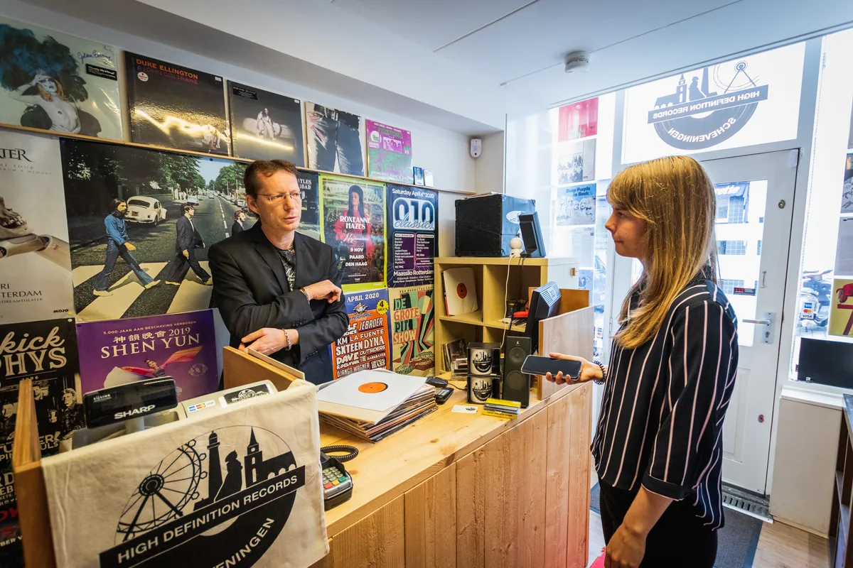 Naast de grote collectie platen vind je bij High Definition Records ook cd’s, cassettebandjes en sinds kort ook vinylklokken. “Die klokken worden nu ook gemaakt met mijn eigen logo. Ik verkoop ze nog niet, want de eerste hou ik nog even voor mezelf!” Over klokken gesproken: voor ons is het helaas alweer tijd om door te gaan naar het volgende interview. We verlaten de Keizerstraat en zetten koers naar het centrum van Den Haag…