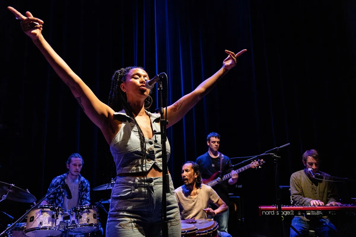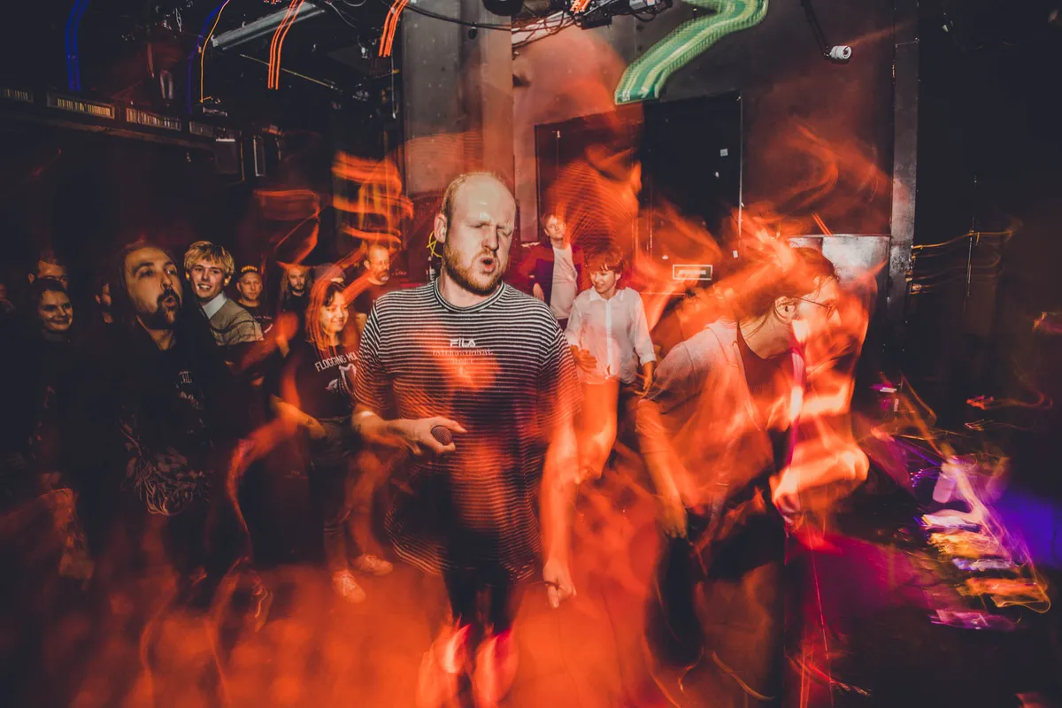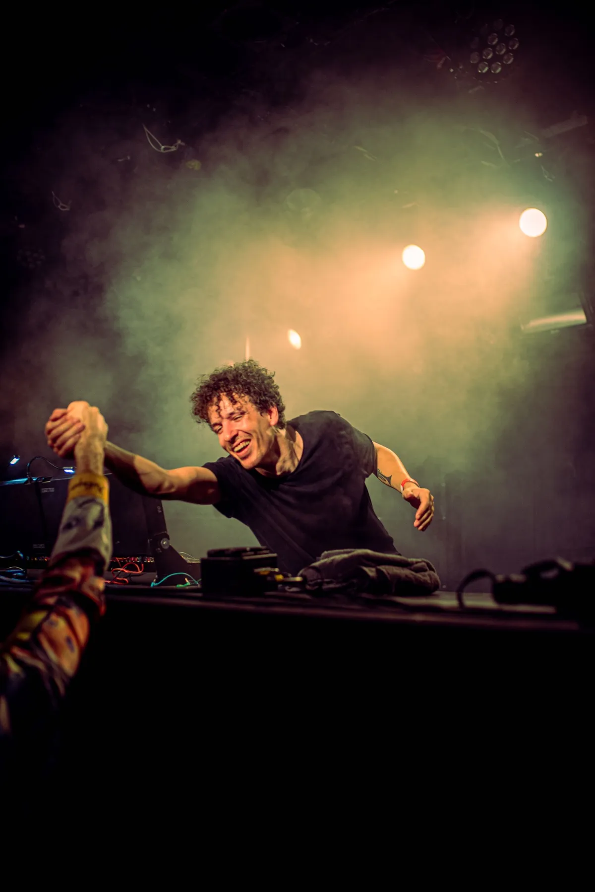 “Tijdens de Popronde valt de nacht als De Toegift bij EKKO de zaal bespeelt met hun tedere en jazzy Zeeuws-Brabantse Nederindiefolk. Terwijl de boomlange frontman Maxim Ventulé neerdaalt vanaf het podium en als in slow motion door zijn publiek zweeft, betovert hij iedereen met zijn maraca en lieve teksten. Dit vond ik een prachtig intiem moment, waarbij ik dicht op de huid van Maxim zat om deze foto te maken.”