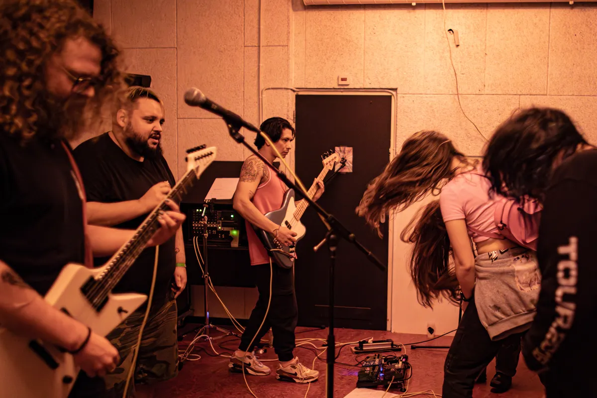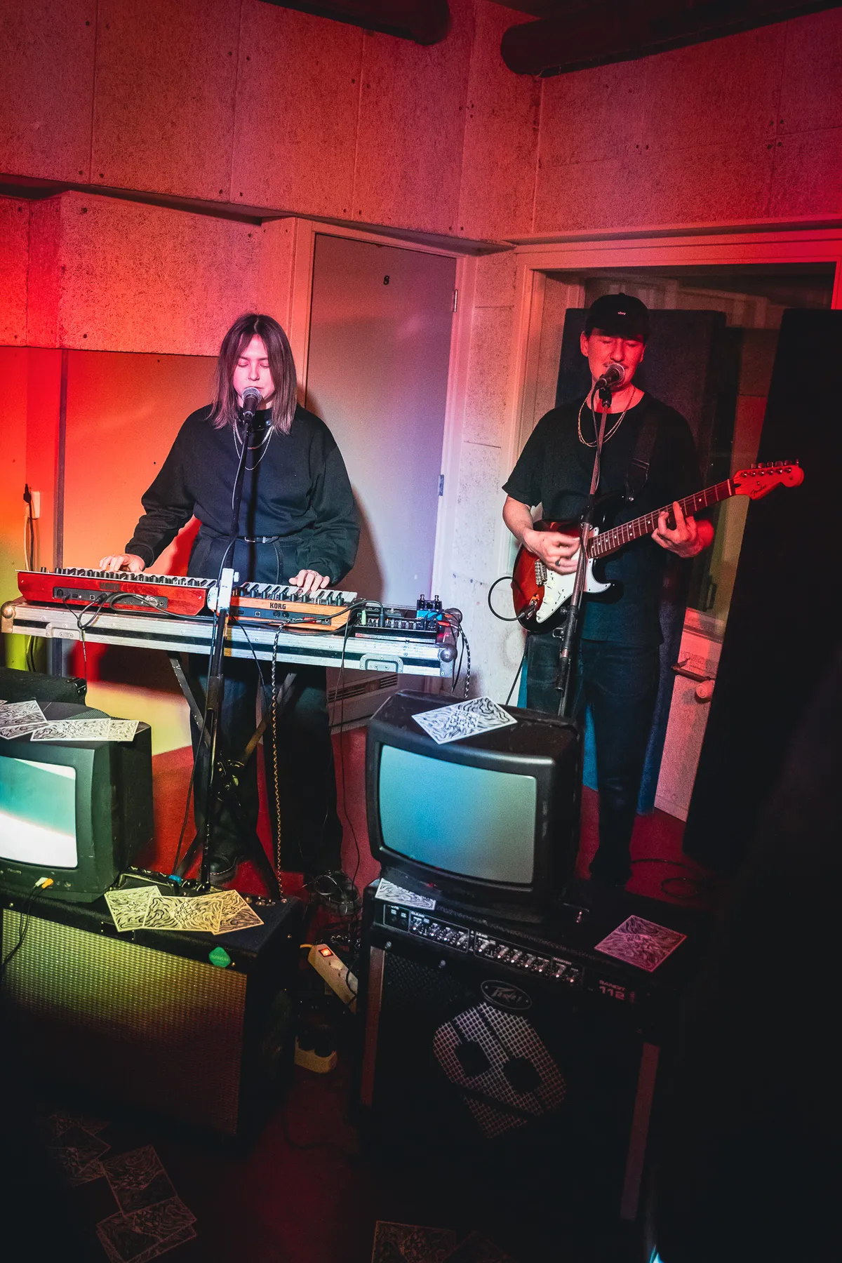En dan is het tijd voor heel wat anders. Tussen al het gitaargeweld voelt Two End Faces in de (Not So) Quiet Room als een oase van rust. Het duo bouwt met kalm getokkel op de gitaar en langgerekte noten op de synth: geluidscollages waar een- of tweestemmig overheen wordt gezongen. De stemmen van Caspar en Gaby Broekhuijsen sluiten naadloos op elkaar aan en het bescheiden opgebouwde decor met oude televisieschermen en visuals maakt het plaatje af. Een deel van het publiek gaat er even bij zitten. “Wat zijn jullie een goed luisterpubliek”, zegt Gaby opgelucht. En dat is inderdaad bijzonder, denkend aan de moshpits die simultaan losbarsten in de naastgelegen ruimtes.