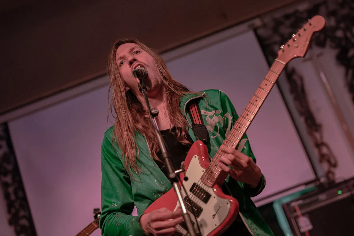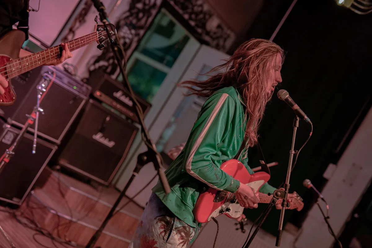 De leeggehaalde concertzaal waar de ene helft van de concerten plaatsvindt, geeft het gevoel dat we hier bij underground optredens zijn. Ergens in een lege loods, met muren die gaandeweg de avond steeds meer beklad raken. ‘Fuck de koning’ staat er achter de band – een reminder dat het nog steeds Koningsdag is, maar who cares dat de koning jarig is? Het slotfeest van dB’s is veel belangrijker dan dat.