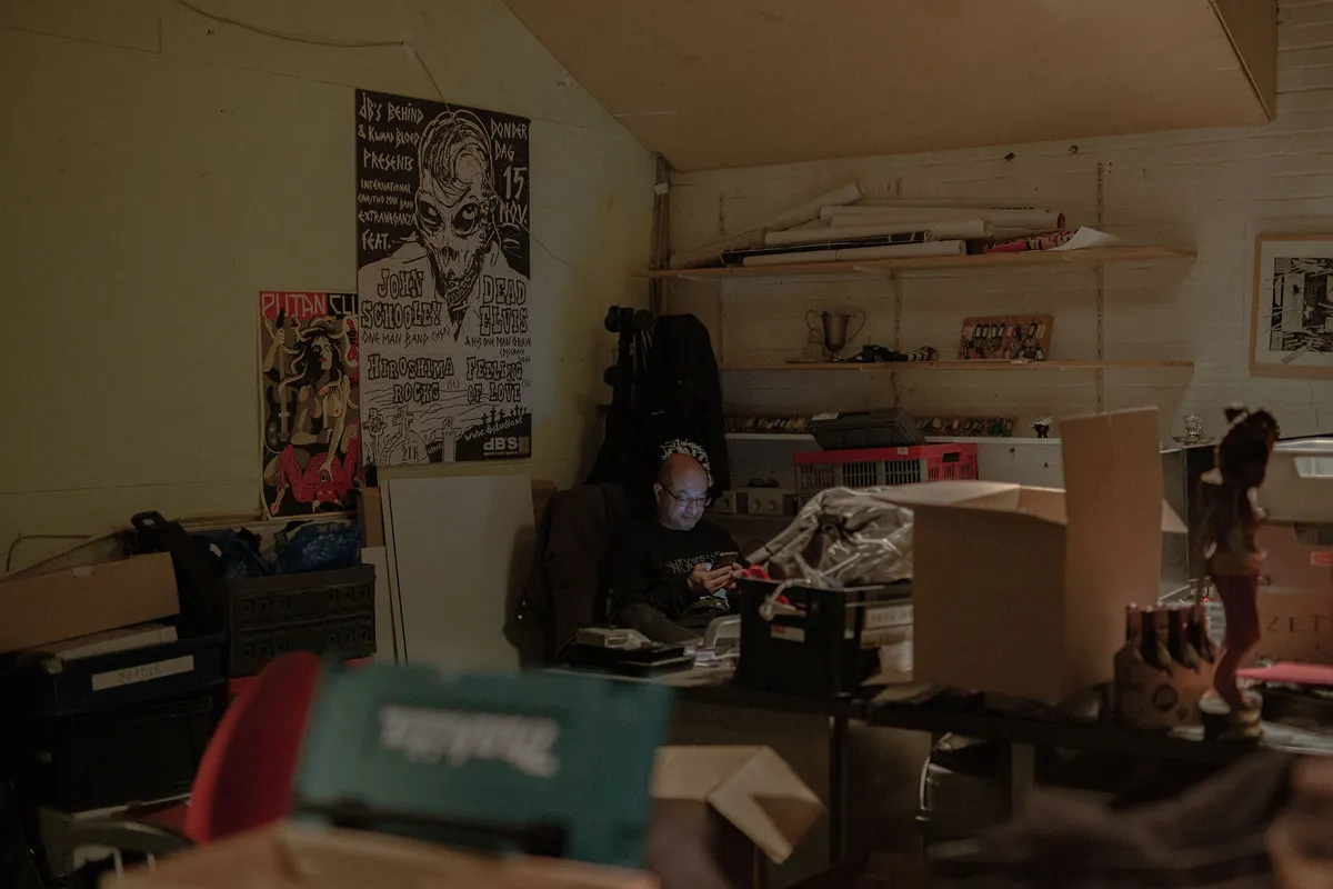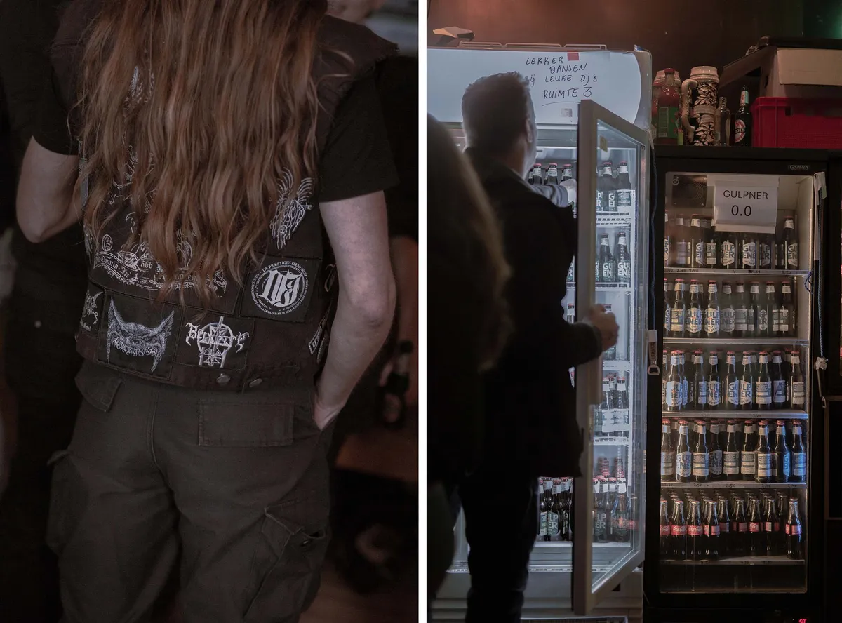 Wat er nog wel staat zijn twee basale speelplekken in de zaal in het café en een dj-set in oefenruimte 3 voor wie wil dansen. In het café staat nog wel een hele batterij koelkasten, gevuld met een simpel maar doeltreffend assortiment: (0.0) bier, cola en een beetje ander fris, water en wijn. Iedere bezoeker kan dat zelf pakken, want ook dit festival is grotendeels een DIY-operatie. Er zijn twee geluidsmensen (Bert en Mike), maar de bands zorgen er zelf voor dat er op tijd wordt omgebouwd. Bij de ingang zitten een paar mensen voor de kaartjes en er zijn nog enkele medewerkers die de lege flesjes uit de zaal of het café in kratten doen. Maar dat is het ongeveer. De bezoekers bestaan uit (oud-)medewerkers, muzikanten en veel mensen die al lang in dB’s komen.