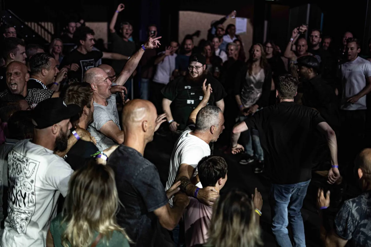 Verspreid over de avond volgt het publiek braaf op wat van hen gevraagd wordt. Van zitten op de grond tot Jordy opvangen die van het balkon springt. Een wall-of-death kan natuurlijk niet ontbreken, al eindigt dit in een soort grote blije groepsknuffel waarna iedereen springend uit elkaar gaat. Nog een tip voor als je gaat stagediven. Dat kan natuurlijk. Maar, spring dan wel in het publiek dat je op wil vangen. En niet ernaast.