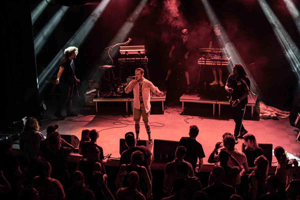 De avond begint met eenman show MAASK. Met stemvervormers en een loopstation kan je blijkbaar heel ver komen. Een bass die tot het diepste doordreunt en melodieën die blijven hangen. Bijzonder, als je bedenkt dat al die geluiden uit één persoon komen. De muziek zorgt dat de spiertjes goed los komen. Droge humor en ongemakkelijke gesprekken en -stiltes zorgen ervoor dat je deze man niet zo snel vergeet. Een heerlijk voorprogramma.