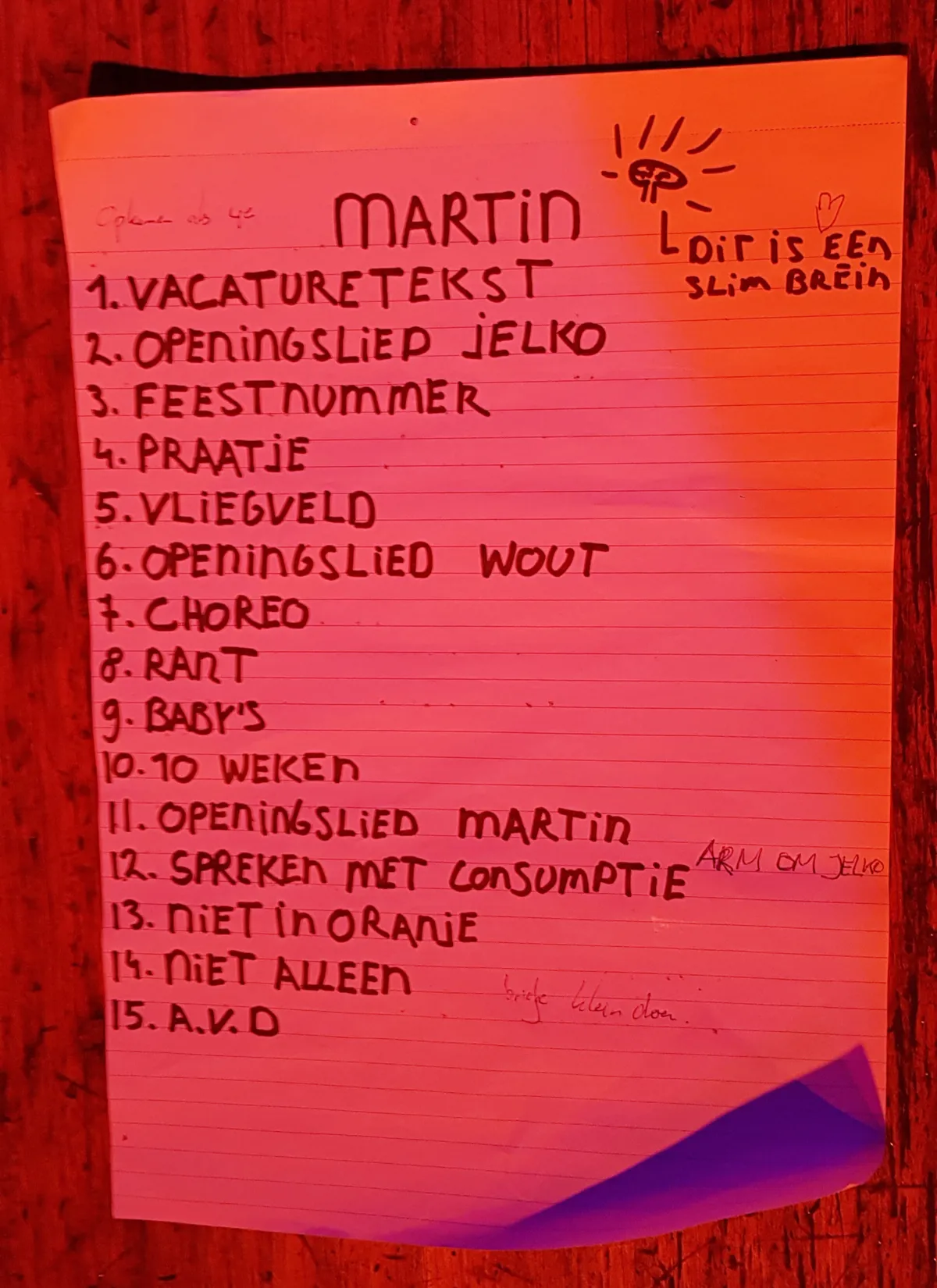 Tekst is bij het vijfkoppige gezelschap een belangrijk thema. De muziek is een aanvulling op de poëzie die zij voordragen. Zo draagt Laurens van de Linde de volgende tekst voor: ‘’Ik wil mijn hoofd op een T-shirt van een fan geprint, totdat het refrein begint.’’ En voilà, Koen Frijns start een baslijntje. Het refrein kan beginnen.