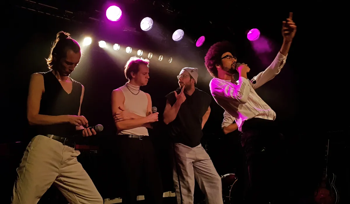 De keuze om ‘boyband’ in de bandnaam op te nemen, blijft zeker niet onopgemerkt. De teksten bevatten een prima ‘gillende-fangirls-achter-ons-aan’ gehalte. Zo hoor je het publiek lachen bij teksten als 'we willen handtekeningen op bierviltjes zetten’ en ‘we willen meisjes die met ons mee op luchthavens blijven lummelen'. Ook geniet het publiek van de (soms niet al te scherpe) choreografie. Terwijl Martin Rombouts – die we afgelopen week bij tv-programma De Slimste Mens mochten aanschouwen – de tekst van ‘Feestnummer’ inzingt, staan de vier anderen hun ingestudeerde danspasjes uit te oefenen. Totdat het refrein begint. Dan beginnen ze alle vijf te dansen en wordt Martin zelfs opgetild.