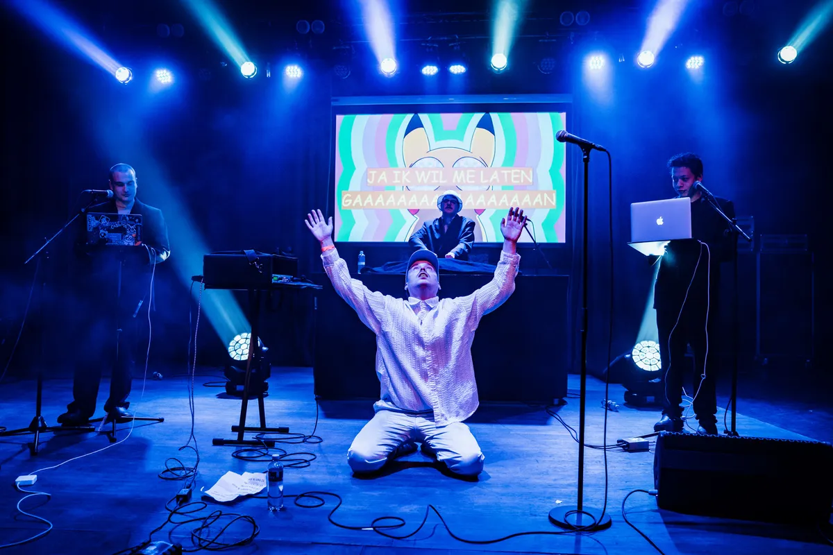 De dansmoves moeten nog even wachten, want we beginnen op De Rem. “Er mag absoluut niet gedanst worden.” Dat blijkt nog een hele klus voor het publiek. Iets minder voor NONCHELANGE zelf en de 3 mannen in pak die met hem op het podium staan. Kneiterserieus, computertjes voor zich, en soms aangevuld door de Google Translate-stem. En natuurlijk wordt iedereen ook nog even lelijk genoemd, want "iedereen is lelijk als je maar lang genoeg kijkt". Een show vol droge humor, soms een tikkeltje absurdistisch, maar vooral lekker nonchalant.