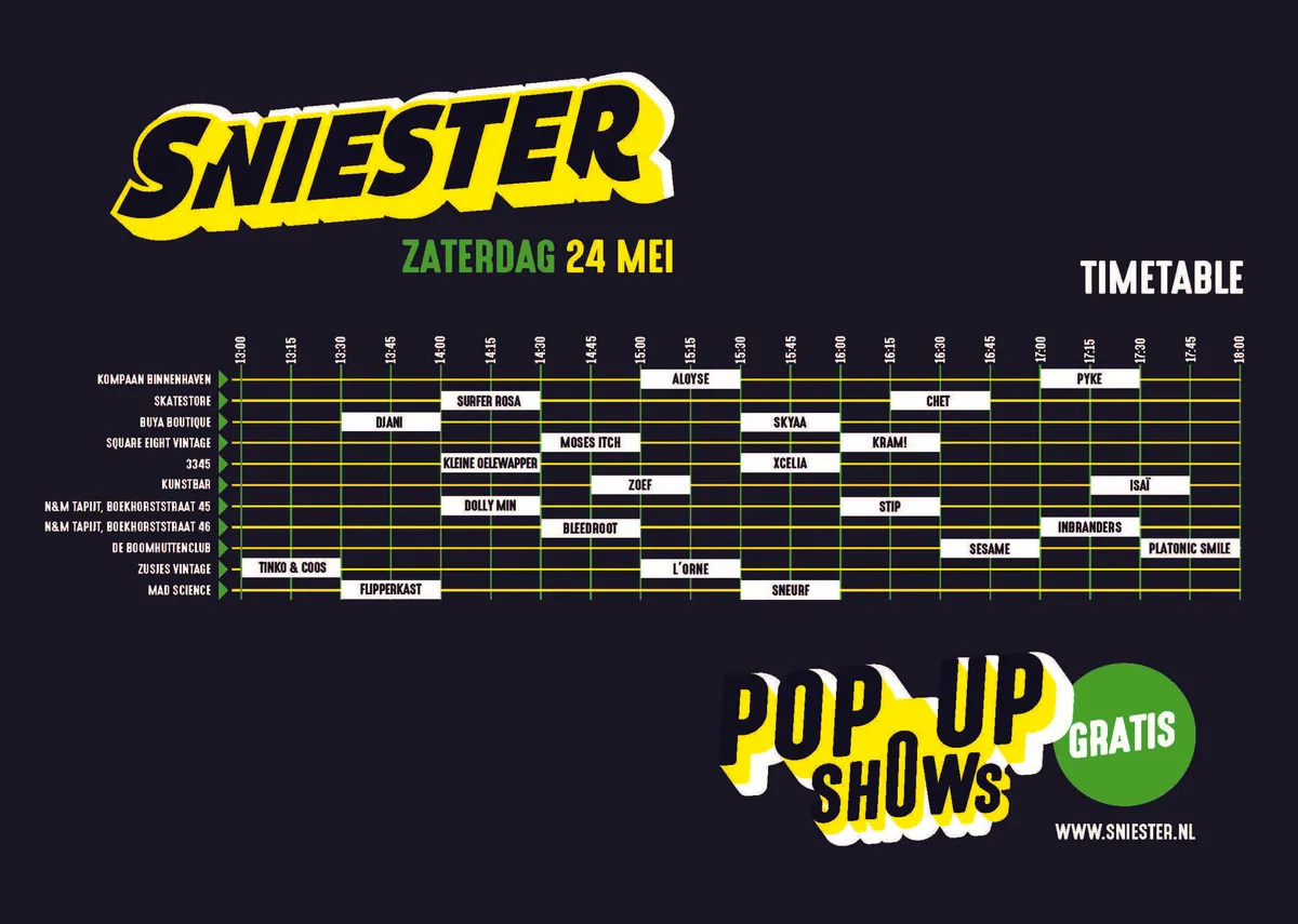 De Sniester pop-ups geven een podium aan opkomende, ambitieuze bands, die eerder nog niet veel te zien waren op publieke podia. Maar liefst elf verrassende plekken in de stad worden op 24 mei voor een dag omgebouwd tot een professionele eventlocatie. Iedere locatie host twee acts. "Dit jaar zijn er weer veel nieuwe bijzondere plekken bijgekomen, zoals de Boomhuttenclub en de tapijtwinkel N&M op de Boekhorststraat", vertelt Guus, terwijl Mila arriveert en ook plaatsneemt op het terras. "Zelf woon ik om de hoek van de Boekhorststraat," vult ze aan, "en ik wist dat ze bezig zijn de straat levendiger te maken. Toen ik de tapijtenwinkel vroeg, werd het rijtje aan locaties binnen mum van tijd aangevuld met andere plekken in de straat."