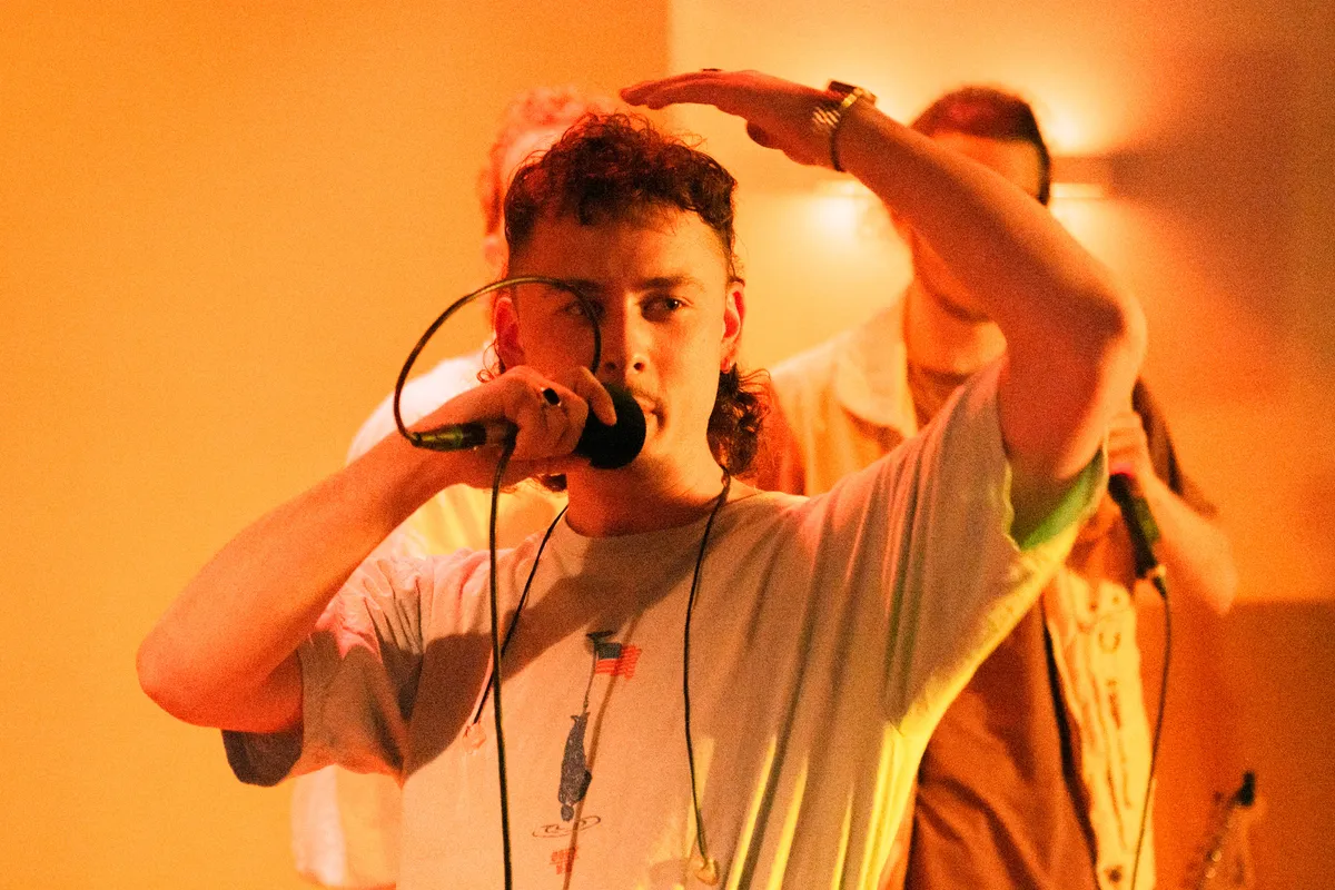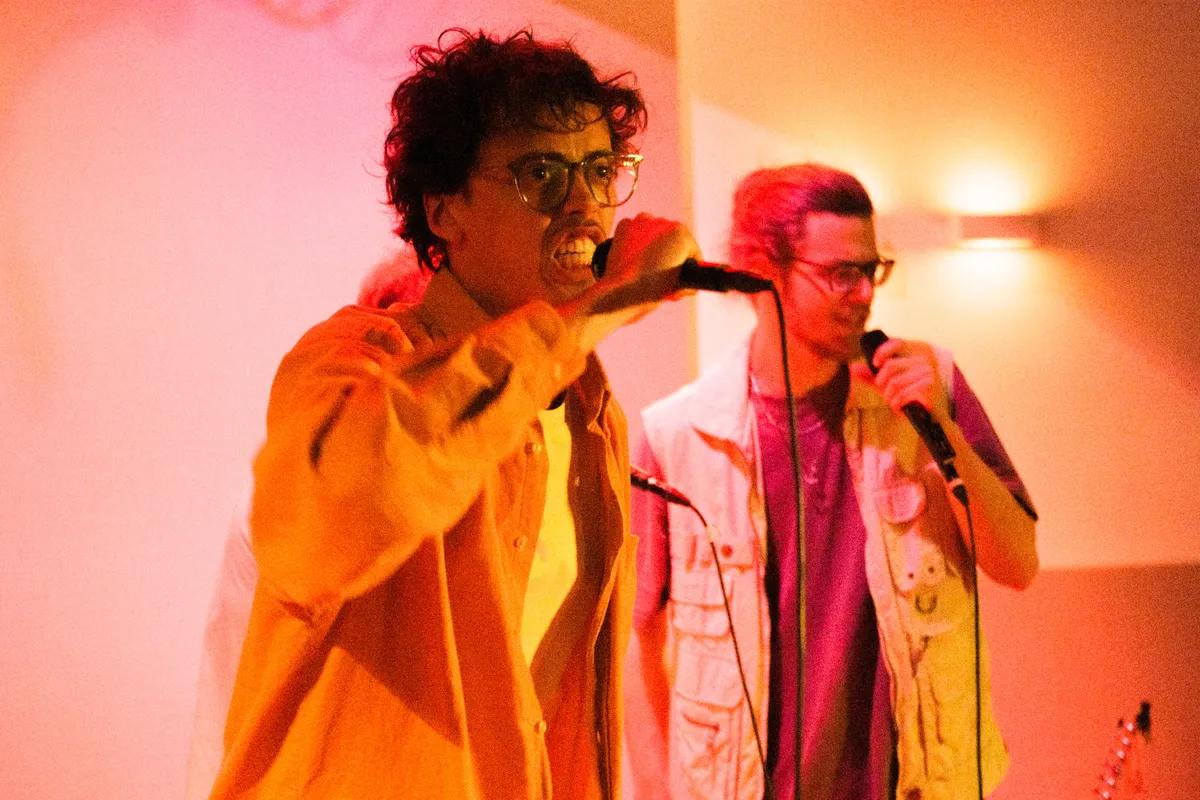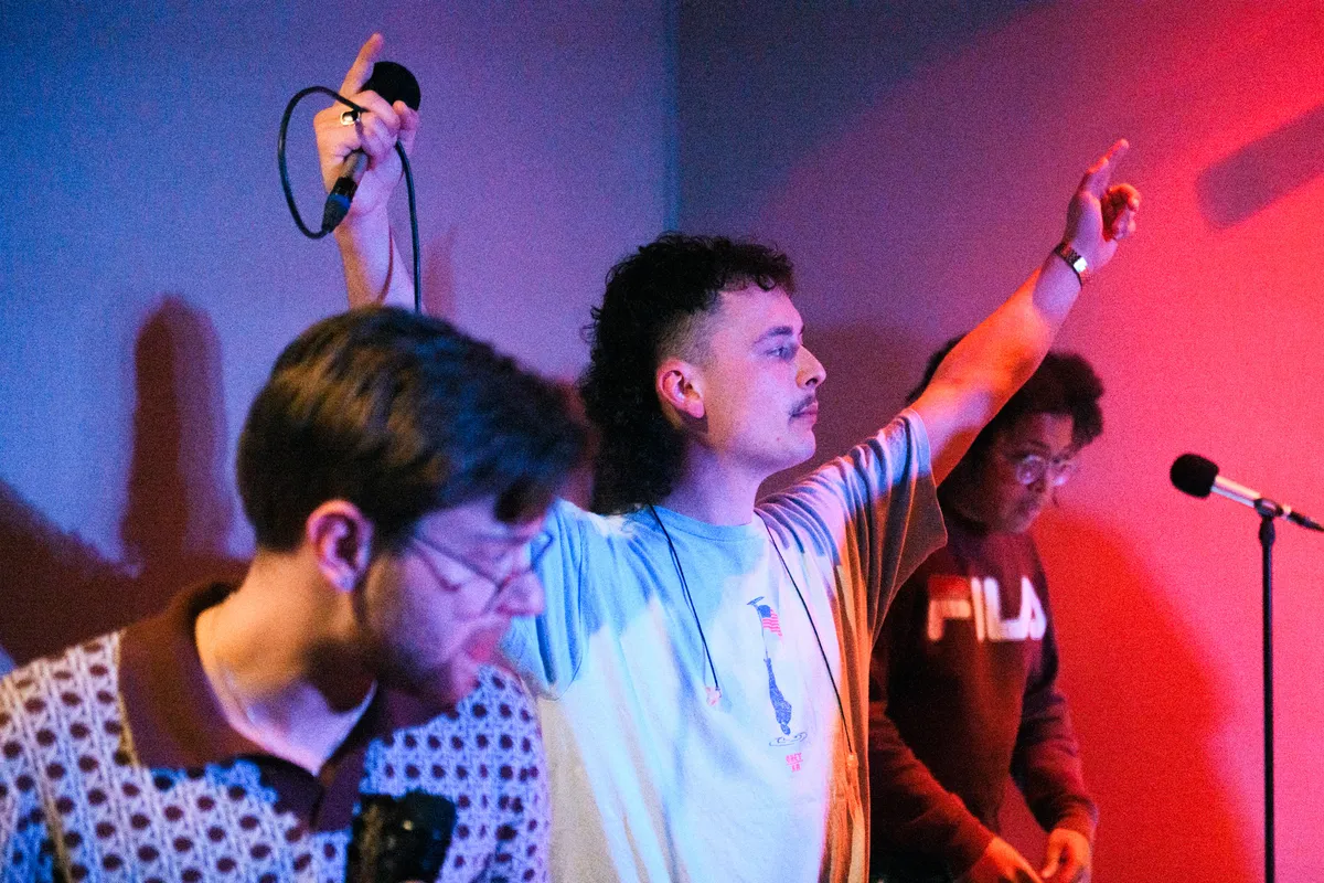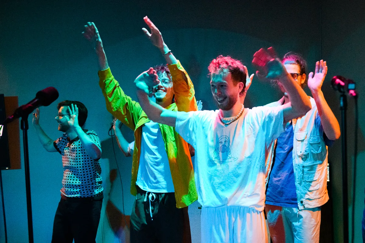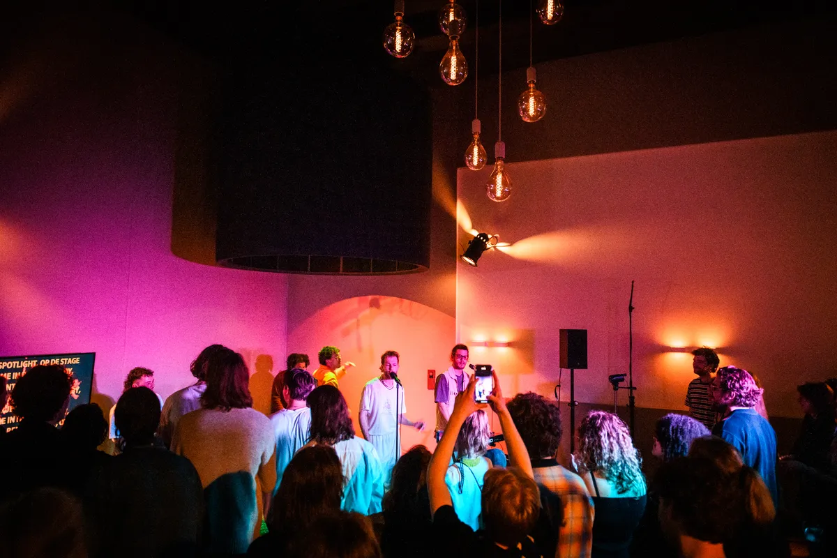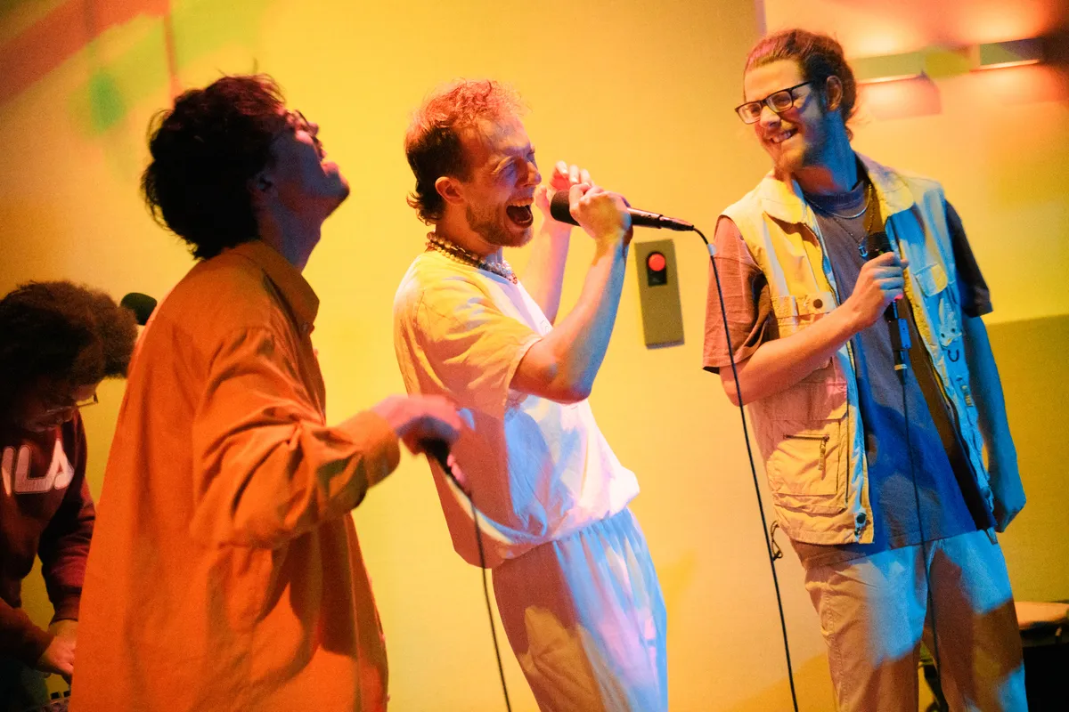 Ongeveer 45 man, vooral bestaande uit een hoop bekenden van de band, heeft zich verzameld op deze unieke locatie en rapt bijna elk liedje mee. Tijdens het nummer ‘Spotlight’ deinsen alle hoofden mee en lopen de boys vol zelfvertrouwen over de studiovloer terwijl ze teksten spitten als: “In de spotlight, op de stage // Hou me in de gaten baby, want ik ga erheen // Ik wil dat je bij mij bent baby, maar je vind mij lame”. Geen fout wordt gemaakt, geen woord wordt verwisseld, De Tuinhuis weet maar al te goed hoe ze het publiek aan hun voeten krijgen met catchy beats en gehypte atmosfeer. Diepgravend zijn de teksten niet, maar daar gaat het ook niet om: deze jonge gasten willen niets liever dan een dansende zaal vol blije mensen.