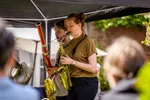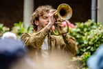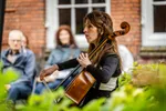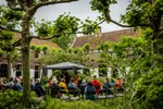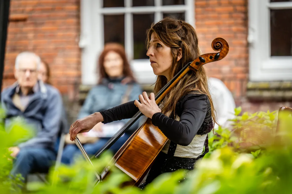 Het Heilige Geesthofje kan ook deze tweede pinksterdag niet achterblijven. Vandaag mogen wij er begeesterd worden door Lidy Blijdorp, een gelauwerd celliste. Vlak voordat de regen weer aanvangt, zetelt ze zich onder de partytent die, zoals bij elke windvlaag blijkt, een spijkertje extra in de grond had mogen hebben. Blijdorp geeft een kleine les luisteren en laat verschillende nuances en accentueringen horen die bijvoorbeeld Bach en Cassado in hun cellostukken verwerkten. Ze beheerst de muziek volledig in haar hoofd én in haar handen, bewijst ze wanneer niet alleen de partytent opwaait, maar ook haar bladmuziek. Het doet de celliste niks. Haar spel is verrassend en lijkt een soort naïviteit te waarborgen, zonder onvolwassen te klinken - alsof de melodie zich constant nieuwsgierig afvraagt hoe hij zich verder zal ontwikkelen. De moderne jas die Blijdorp aan de klassieke muziek geeft, is van zinderende elegantie.