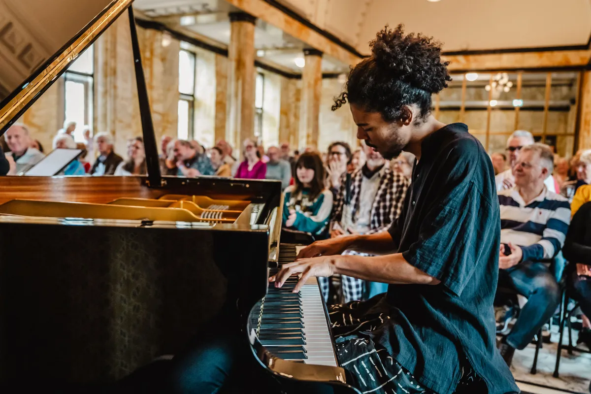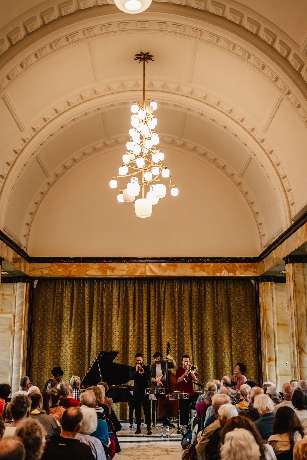 Waar Daahoud Salim op de zondag klassiek werk in zijn eentje vertolkte, knalt de Burgerzaal deze maandag bijna uit zijn voegen wanneer hij met zijn kwintet begint te spelen. Salim zit achter zijn vleugel en wordt geassisteerd door contrabas, drums, trombone en trompet. De akoestiek is tussen dat marmer om te janken, maar het Daahoud Salim Kwintet houdt zich kranig overeind in de galmbak. Vooral de drum, die kraakhelder in zijn articulatie weet te blijven, verdient hierin een compliment. Er is niet eens ruimte voor eventuele tranen van verdriet - dit is jazz van wereldniveau om bij te janken van geluk.