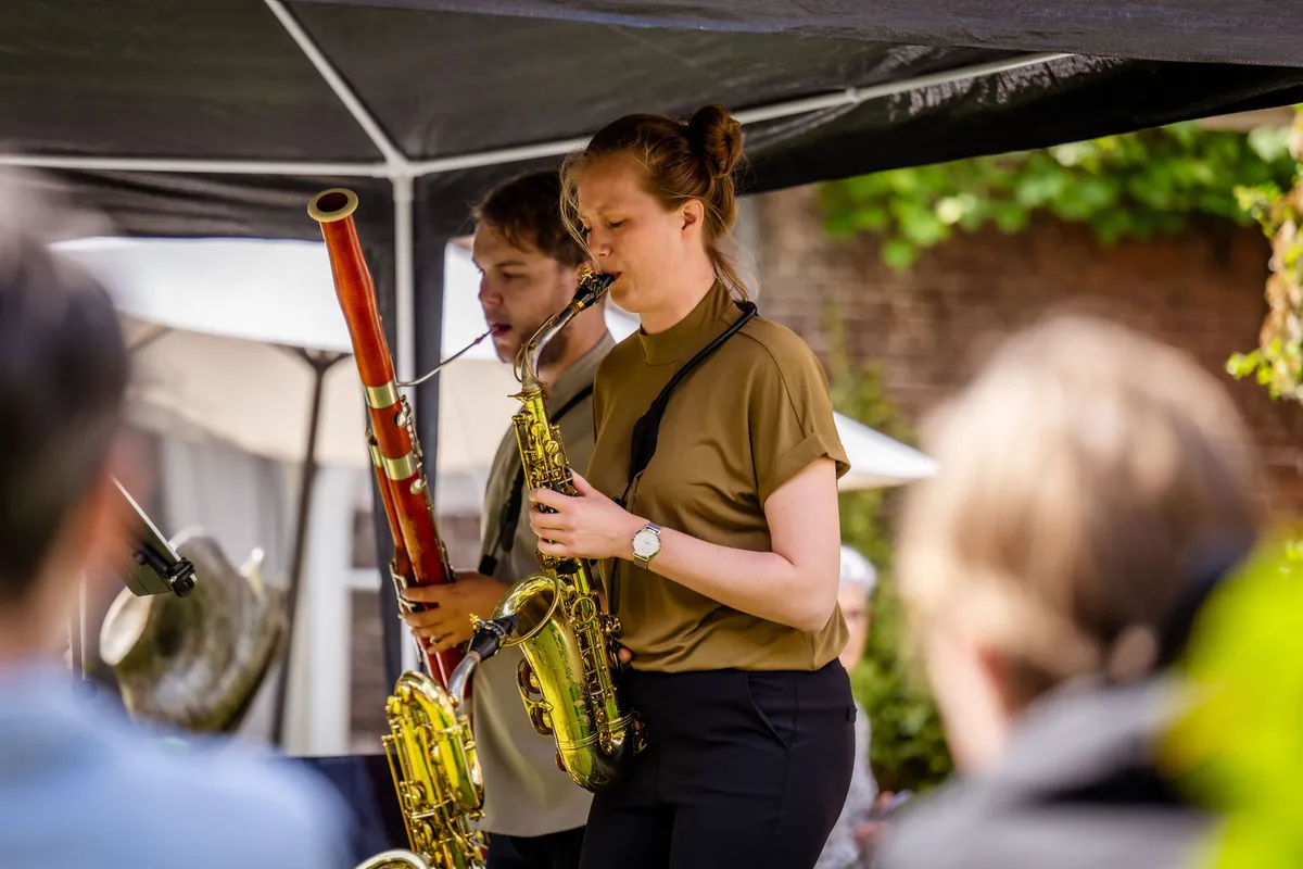 In het Sionshof worden we opgewacht door de verrassende combinatie fagot en baritonsaxofoon, bespeeld door Thomas Dulfer en Deborah Witteveen. Beide instrumenten worden weleens schertsend uitgemaakt voor "chromatische regenpijp", maar, isn't it ironic: precies nu breekt de zon door. Na een duet met hun twee lagere rietinstrumenten, pakt Witteveen haar sopraansaxofoon erbij. Het volgende stuk wordt beschreven als een combinatie tussen barok en Ierse folk - een treffende schets, wegens de springerige cadans en de hoge drive die het duo erin weet te brengen. Na een rondje 'Lang zal ze leven' op sopraan voor een jarige bezoeker, wordt de baritonsax er weer bijgepakt voor een bewerkt operastuk van Rossini.