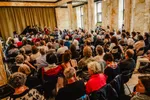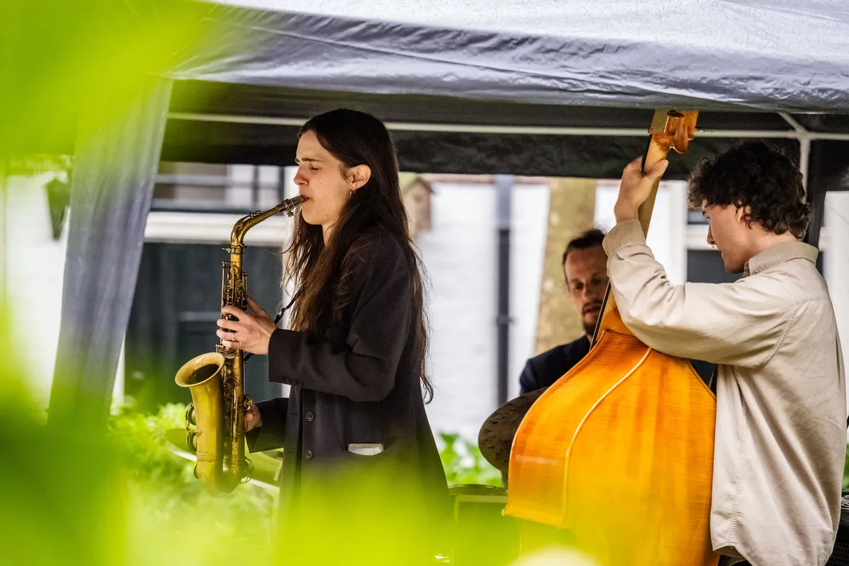 Na een regenachtige wandeltocht naar het Meermanshof, waar sopraan Lucretia Starke en gitarist/ luitist Ekatarina Uvarova in de Regentenkamer spelen, blijkt er geen ruimte te zijn voor nog meer publiek. We kunnen door een open raampje een glimp van Starkes sprankelende stem opvangen, maar de tocht zal toch verder moeten gaan. Het programmaboekje belooft ons jazz in het St. Salvatorshof, in de vorm van Kika Sprangers. Zij bespeelt de altsaxofoon, en wordt bijgestaan door contrabassist Ton Felices en drummer Jamie Peet. Normaal gesproken is haar entourage groter, maar het weerhoudt haar er niet van welig te soleren. Waar de bas en drums soms, voor de ongetrainden onder ons, klinken als een mijnenveld waar je geen stap verkeerd kan zetten, weet Sprangers er met haar virtuoze spel toch een bloemenveld van te maken.
