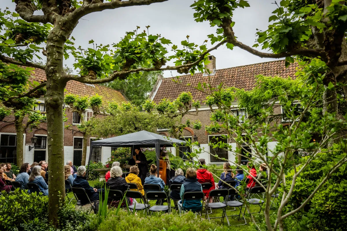 Amper bijgekomen van de eerste dag van het Leidse Hofjes Festival beginnen we aan de tweede, met nog meer acts om langs te wandelen op verschillende locaties. Deze maandag, tweede pinksterdag, voelen we de kater van de eerdere uitstorting van de Heilige Geest en proberen we onze weg tussen de regendruppels door te vinden. Het weer bleek gelukkig even gevarieerd als de louter zonnige programmering, waardoor niemand onverzadigd naar huis hoefde te gaan.