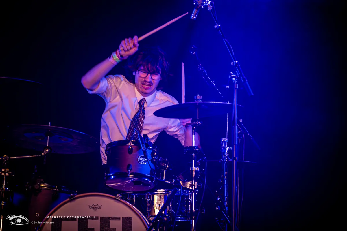 Om zo’n verhaal te kunnen vertellen moet je wel multi-instrumentalisten op het podium hebben staan, en die zijn er. Zo haalt de toetsenist een saxofoon tevoorschijn, en kruipt de tweede gitarist na een overtuigende beurt als vocalist met allerlei effectpedalen ook nog eens achter het tweede drumstel. Inderdaad, twee drumstellen, en jaw dropping synchroon.