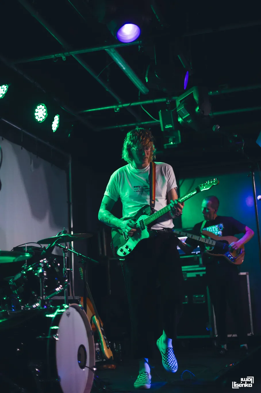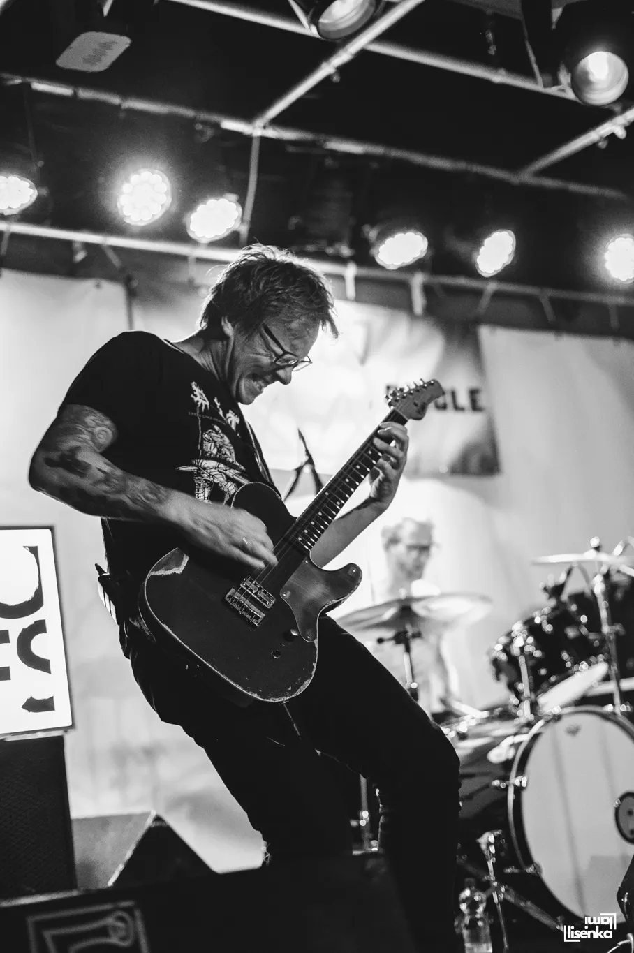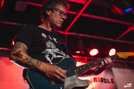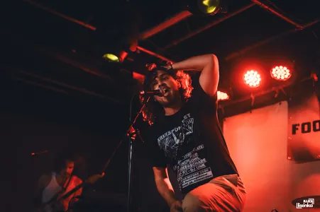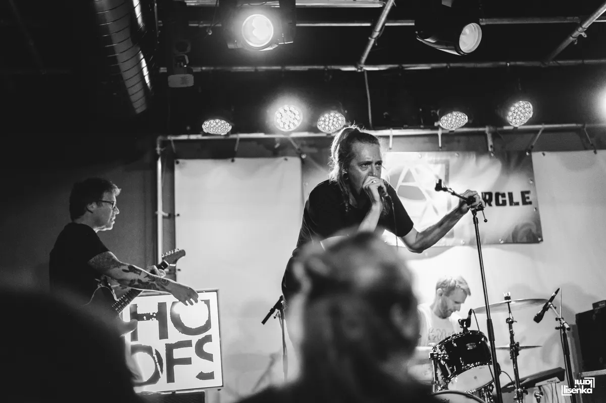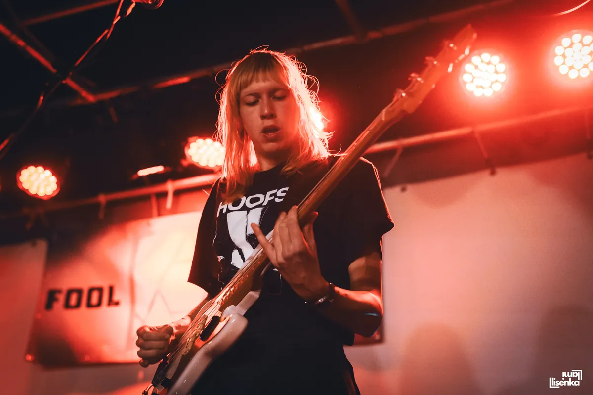 HOOFS heeft een frontlinie met allemaal beweeglijke spelers, om het in voetbaltermen te zeggen. De twee gitaristen, bassist en zanger bewegen allemaal, gaan door hun knieën, spelen lijf aan lijf, springen dan het publiek in, of op de catwalk die naar het podium leidt. Ook de gitaren zijn lekker actief en reageren op elkaar. "Mede-gitarist Lukas en ik kijken tijdens een optreden naar elkaar en doen dan allebei net wat anders. Als ik bovenaan de hals speel, speelt hij onderaan, of andersom. Zo houd je het dynamisch," vertelt gitarist Richard Lagerweij achteraf. Je ziet aan alles dat dit ervaren mannen zijn die weten hoe je het publiek bespeelt.
