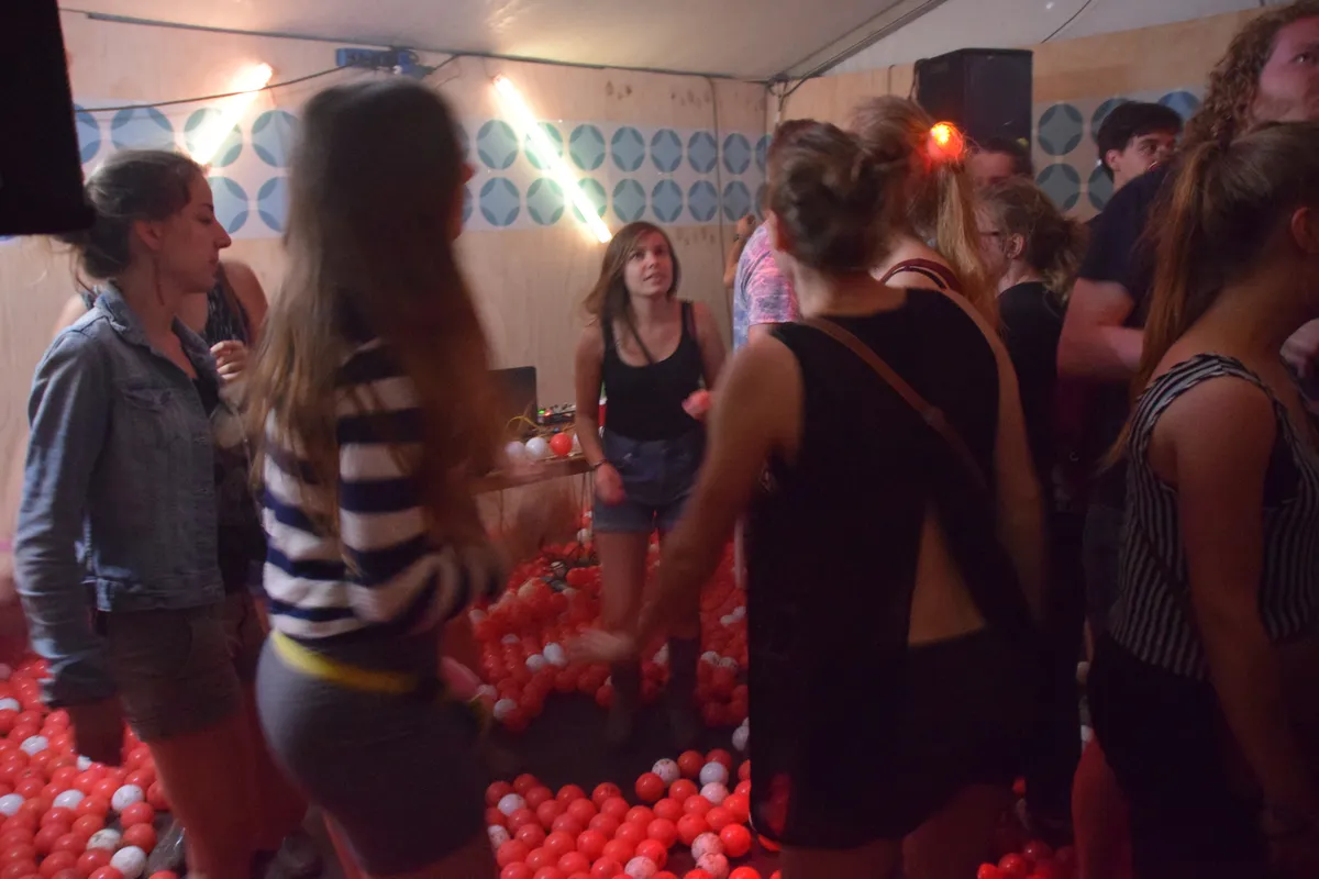 In de rechterzaal zijn, ondanks de hoeveelheid ballen, de letters maar lastig te lezen nu de modder plaats heeft gemaakt voor inkt. Het concept lijkt het een beetje aan de gasten voorbij te gaan. Gelukkig is er wel Lingo te volgen op het scherm en loopt er een verdwaalde Francois Boulangé rond. Tekst en foto's: Aukje Verstegen