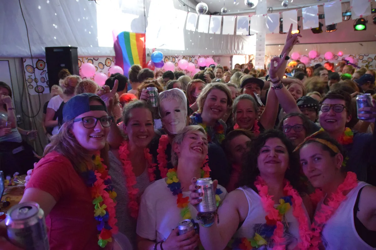 K's Choice, Katy Perry, Lady Gaga, Aqua en de soundtrack van Mean Girls, alles wat je verwacht van een feest door en voor lesbiennes. Vandaag: jonge meiden net uit de kast. In de andere zaal: Lingo de tracklist, grabbel ballen met letters van de artiest uit de soundboks en vind de groene bal.