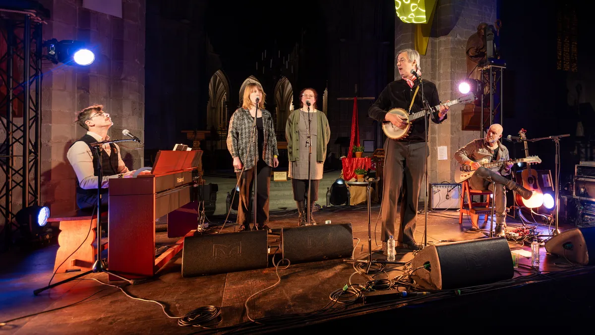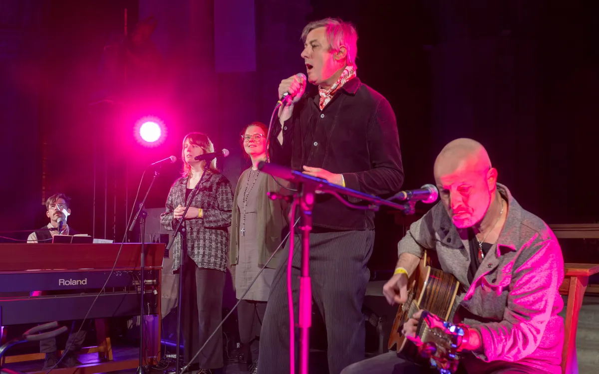 Terug in de basiliek brengt broeder Dieleman iets wat naadloos hier op deze plek past: verstilde, verhalende liederen, geworteld in de Zeeuws-Vlaamse klei. Met banjo, gitaar en toetsen, en ondersteund door een engelachtig koortje, neemt hij het publiek mee langs verhalen van vroeger. Tussen de nummers door schetst hij herinneringen en anekdotes, alsof hij een verhalenverteller is bij een kampvuur. In ‘Gloria’ wandelen we over het Steenovensepad, in ‘Jane Pape’ bezingt hij een vermeende heks. Het slot groeit uit tot een gezamenlijk moment van overgave. “Al wat goed en heilig is, is hier,” zingt het publiek mee – en dat voelt oprecht.