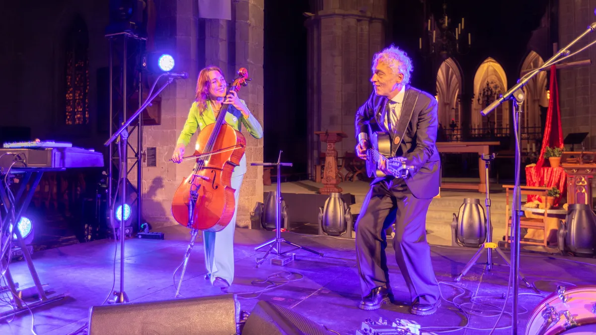 Terug naar de basiliek, waar Spinvis samen met Saartje Van Camp het publiek in vervoering krijgt. Met alleen cello en gitaar krijgen de liedjes van Erik de Jong een nieuwe gelaagdheid. De akoestiek van de kerk vraagt om aanpassing, maar juist die beperking zorgt voor een bijzondere intensiteit. Klassiekers en minder bekend werk vloeien moeiteloos in elkaar over, met ruimte voor improvisatie en subtiele humor. Van het speelse ‘Tingeltangelhersenpan’ tot de indringende ballade ‘Zonder Naam’: elk nummer is een klein verhaal. De cello van Van Camp tilt de muziek naar een hoger plan en maakt het optreden tot een van de meest betoverende momenten van de dag.