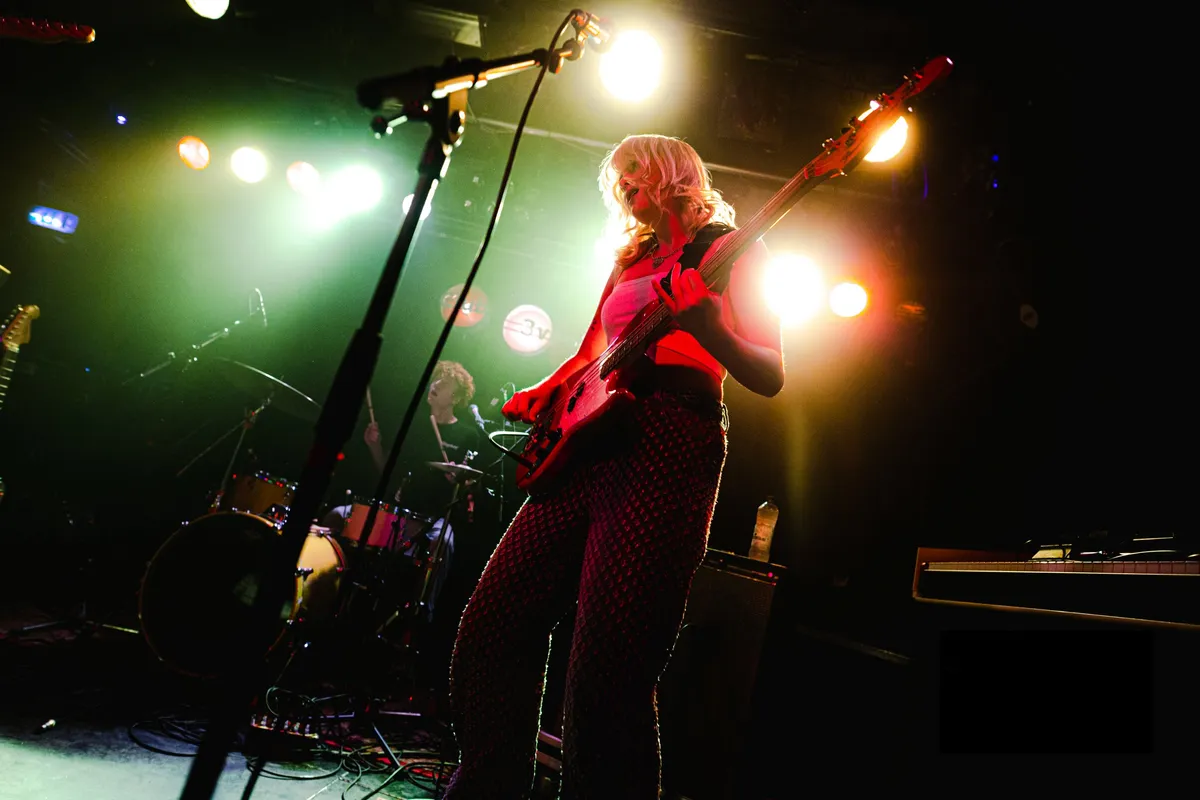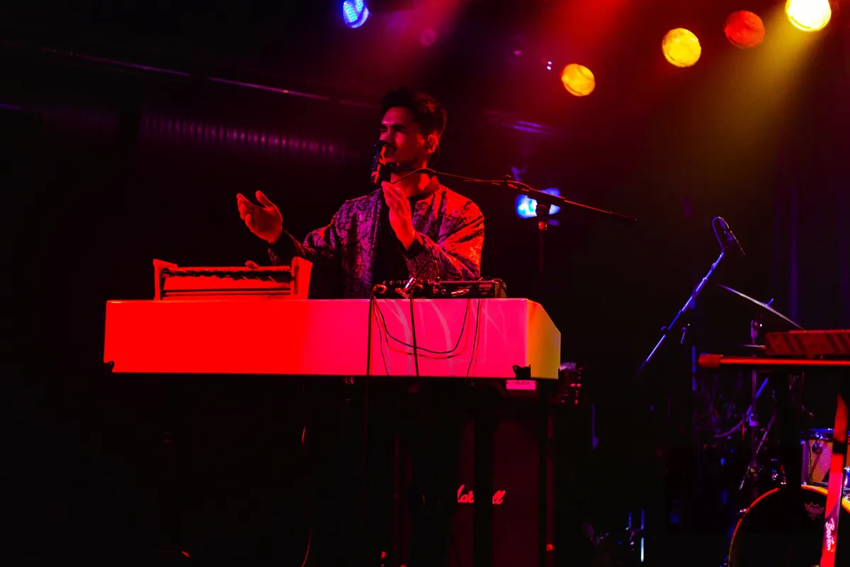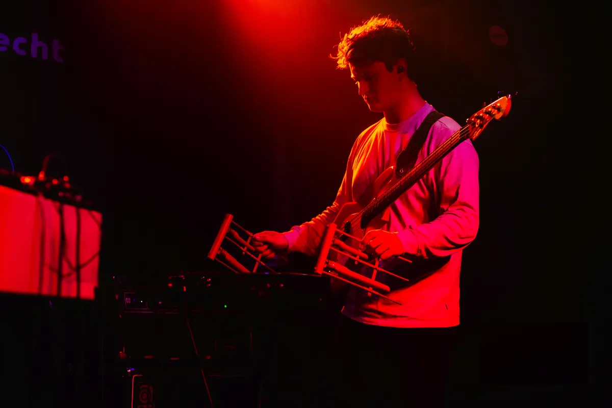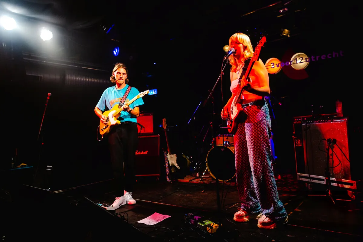 Mood Bored mag de avond openen. De band is een van de VPRO 3voor12-talenten voor de Popronde 2022, maar had in hun drukke agenda toch nog een plekje over voor Club 3voor12 Utrecht. Het Tilburgse trio brengt een indierock geluid met shoegaze gitaarriffs. Hun nieuwste single ‘Pour Into Me’ kwam vorige maand uit en gaat volgens gitarist Daan over het klaar zijn met je leeg voelen. Dit thema, van melancholische teksten met uiteindelijk een positieve boodschap. dekt de lading van de show. Zangeres en bassist Myrthe vraagt het publiek vooraan te komen staan en begint de set met een aantal rustige nummers. Met teksten als “lucky i love you” speelt de band in rood podiumlicht een emotioneel lied over liefde. Myrthe, beter bekend als MAY BBY, brengt glimlachend haar energieke, vrolijke stemming over op het publiek. De band eindigt met een energieke climax met twee nummers die qua tempo en gitaarspel doen denken aan post-punk. De connectie tussen de bandleden in de manier waarop ze elkaar ondersteunen en op elkaar anticiperen is voelbaar.