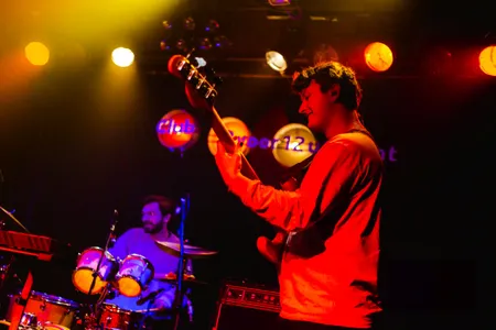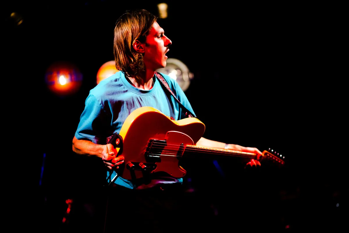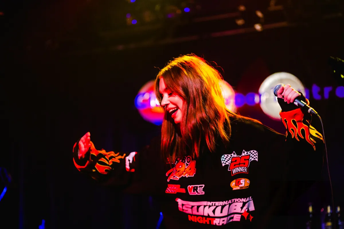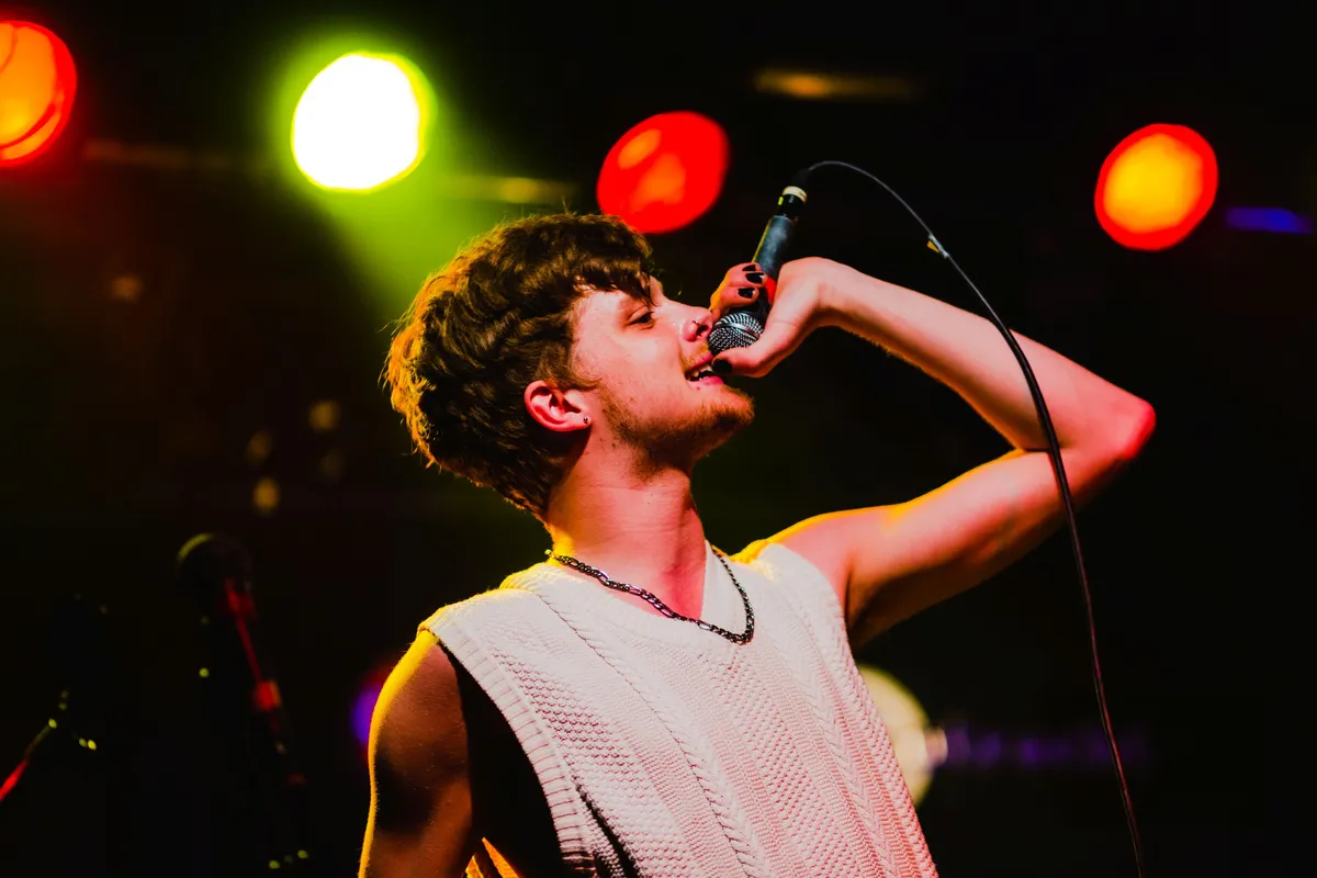 Mood Bored mag de avond openen. De band is een van de VPRO 3voor12-talenten voor de Popronde 2022, maar had in hun drukke agenda toch nog een plekje over voor Club 3voor12 Utrecht. Het Tilburgse trio brengt een indierock geluid met shoegaze gitaarriffs. Hun nieuwste single ‘Pour Into Me’ kwam vorige maand uit en gaat volgens gitarist Daan over het klaar zijn met je leeg voelen. Dit thema, van melancholische teksten met uiteindelijk een positieve boodschap. dekt de lading van de show. Zangeres en bassist Myrthe vraagt het publiek vooraan te komen staan en begint de set met een aantal rustige nummers. Met teksten als “lucky i love you” speelt de band in rood podiumlicht een emotioneel lied over liefde. Myrthe, beter bekend als MAY BBY, brengt glimlachend haar energieke, vrolijke stemming over op het publiek. De band eindigt met een energieke climax met twee nummers die qua tempo en gitaarspel doen denken aan post-punk. De connectie tussen de bandleden in de manier waarop ze elkaar ondersteunen en op elkaar anticiperen is voelbaar.