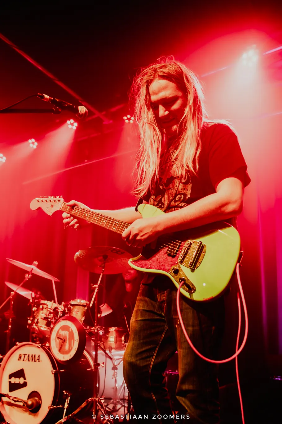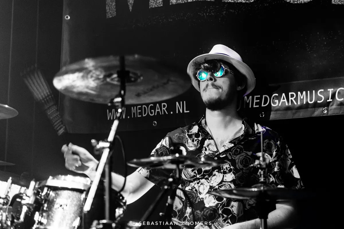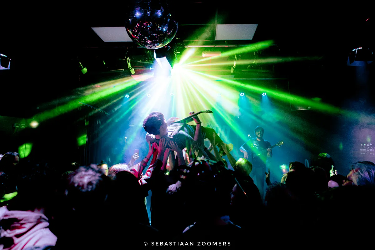 Tijdens het nummer ‘Spaceracer’ gooit Roskamp zich vol overgave in de menigte. Al gitaarspelend en zingend stagedivet hij door de zaal. Bassist Sybe van der Gracht draagt een shirt met de tekst ‘Ik ben bang voor vrouwen’, maar als er iets is waar hij niet bang voor is, dan is het wel een diepe, dreunende bas. Drummer Martijn Janssen zit er nonchalant bij met zijn fedora en zonnebril, maar ramt meedogenloos op zijn drumstel. Gitarist Bansta Blanckenburg doet er nog een schep bovenop met snoeiharde riffs.