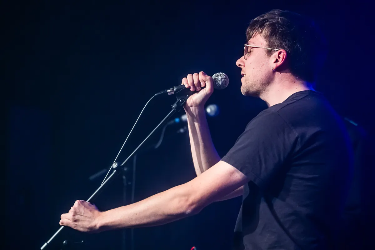 Na een korte change-over, biermoment en rookpauze, is het dan aan Schau Schau om de volle Simplon UP opnieuw op te zwepen. Tijdens de soundcheck kregen we even een valse start toen de band al heel strak zo'n typische motorik post-punk beat inzette en de technicus de lichten dimde. Toen gingen ze weer aan, en bleken alle monitoren goed afgesteld te zijn. Schau Schau kan beginnen. Het podium staat aanzienlijk voller dan bij Plain Bizarre. Er is een extra bandlid het podium op geklommen en er zijn twee Korg synthesizers meegekomen. Net als hun voorganger is de band vrij nieuw. Ontstaan tijdens de pandemie uit een gemis tussen Kalle Wolters en Maarten Huizing. Met Kalle op de snaren en Maarten als vocalist en toetsenist/knoppendraaier maakt Schau Schau hoekige new-wave, die vooral inspiratie haalt uit bands als Can en Talking Heads, maar ook wel heel erg lijkt op hedendaagse acts als Folly Group en onze eigen Rats On Rafts. Kort gezegd, de fuzzy slacker van Plain Bizarre maakt plaats voor het de hoekige analoge synth geluid van Schau Schau.
