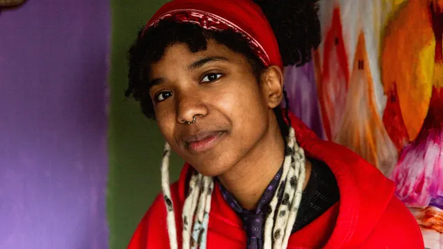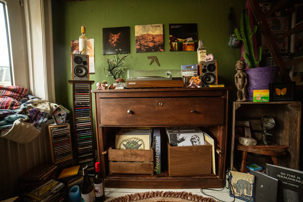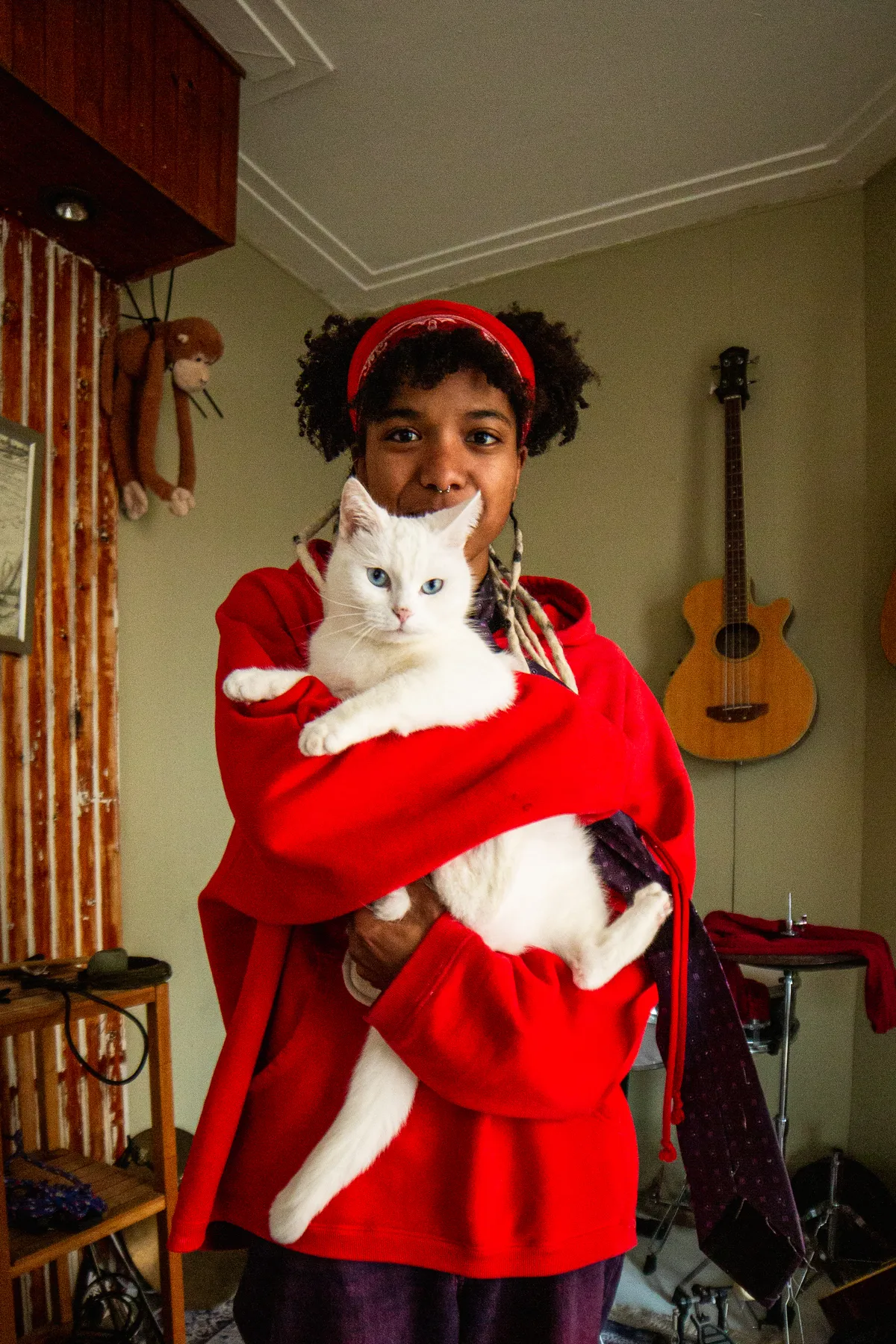 Het welkomstcomité staat bij het binnenlopen al klaar: de vriendelijke witte viervoeter Milo. Achter Milo staat een net zo vriendelijke jonge dame met een uitgesproken stijl, zowel in haar muziek als in haar kleding. Samen met twee anderen woont ze in een antikraakpand, met zoveel Perzische tapijten dat de vloer nauwelijks nog zichtbaar is. Aan creativiteit geen gebrek: samen timmerden ze een heuse boulderkamer in elkaar, richtten ze een houtbewerkingsruimte in voor de nodige klusprojecten, en in de woonkamer prijkt zelfs een podium. Hoe langer je rondkijkt, hoe meer je ontdekt- en hoe groter je nieuwsgierigheid naar de vrouw die hier zo onmiskenbaar thuis is.