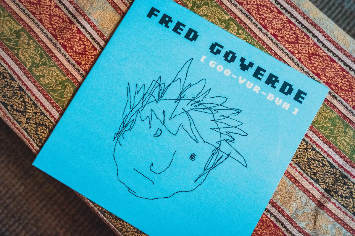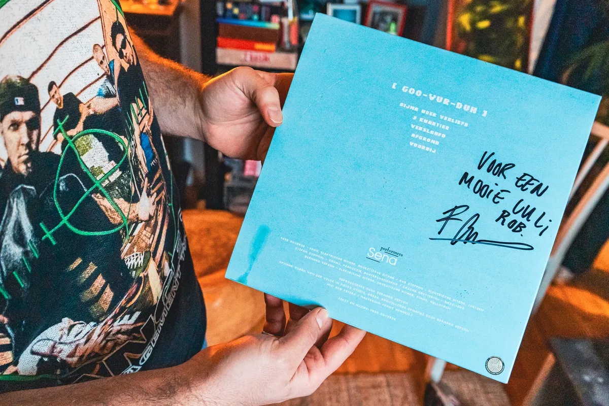 Zegt lachend: “Dat is de plaat goovurduh van Fred Goverde. Ik zou deze plaat krijgen, maar heb ervoor betaald toen we de platen gingen ophalen bij de drukkerij. En dat terwijl ik heel arm was.”