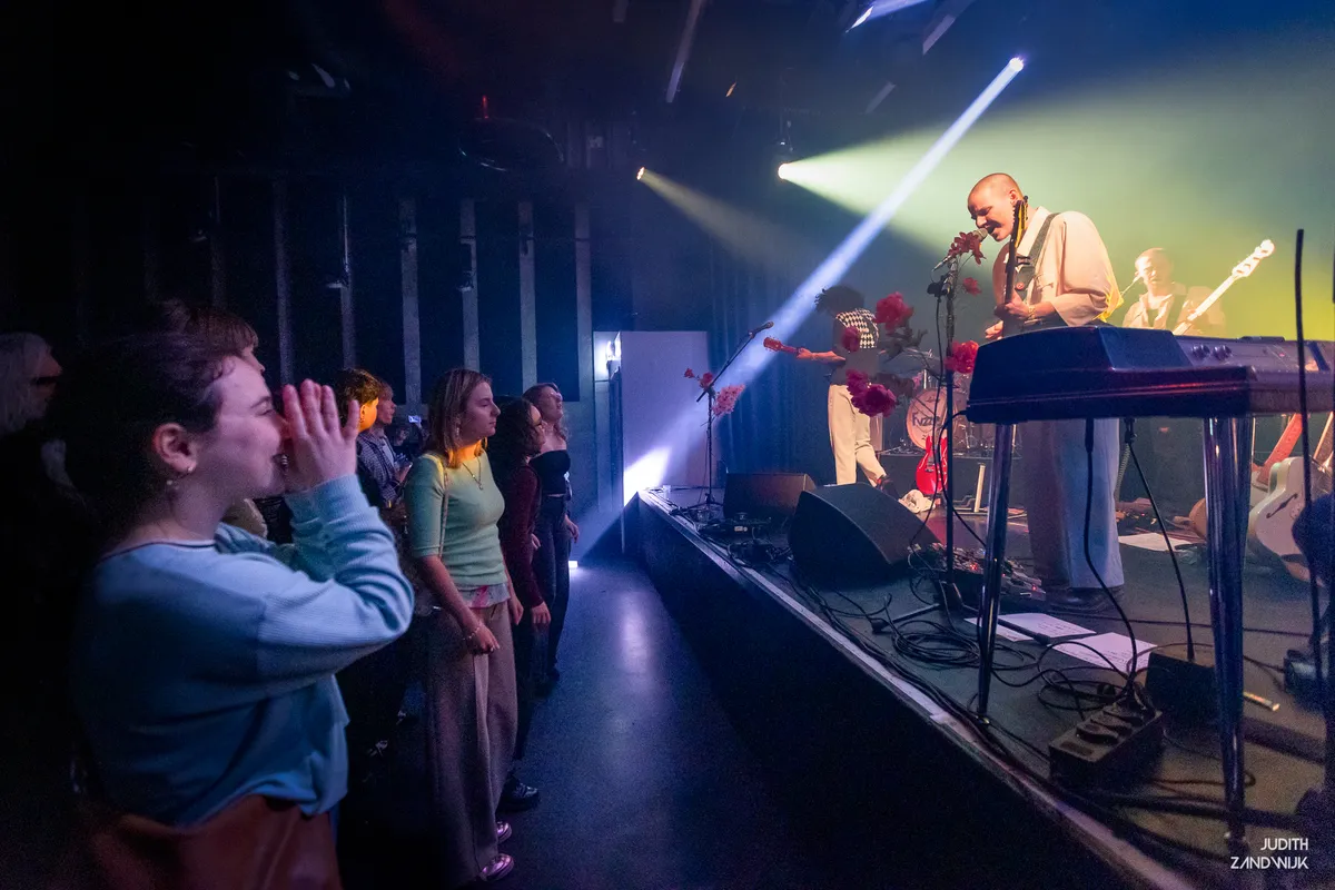 De kleine zaal van PAARD is gevuld en de set start direct energiek. Het publiek warmt geleidelijk op. Dat de zaal er zin in heeft is voelbaar, al duurt het even voordat de eerste rijen echt loskomen. Er wordt enthousiast gereageerd wanneer Koenn vertelt dat er vorige week nog maar zestig kaarten verkocht waren, maar het nu “toch heel erg gezellig aan het worden is”. De energie breidt zich uit en na de eerste drie nummers zit de sfeer er goed in.