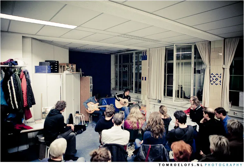 De avond begint op de Van Oldenbarneveltstraat 90. Het atelier van Angela de Jong doet dienst voor het Live in Your Living Room concert van Anne Soldaat en Maurits Westerik (GEM). Ongedwongen lopen de twee daar rond, zich mengend tussen het aanwezige publiek.