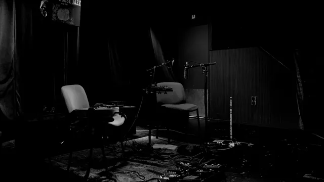 ...alleen twee stoelen, een gitaar, een fluit en op de grond plankjes met effectpedalen..