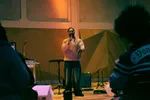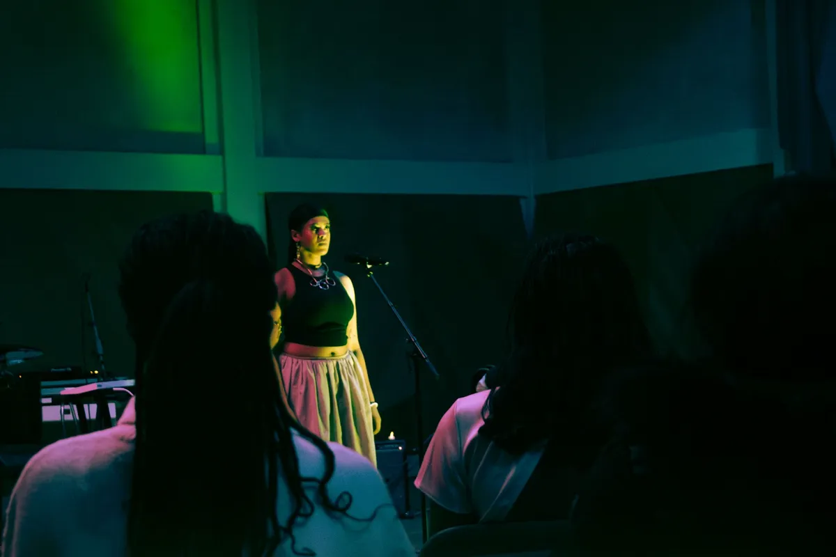 Dan begint de muziek, hetgeen waarvoor we zijn gekomen vanavond. De eerste artiest van de avond is Miché. Gekleed in een simpel wit shirt laat ze de muziek voor zich spreken. Met alleen gitarist Richie om haar te begeleiden toont ze dat er ook niet meer nodig is om haar boodschap over te brengen. Door een cover en drie originele nummers krijgen we een indruk van haar stijl, wat ergens tussen Summer Walker, Snoh Aalegra en vleugje Jorja Smith zweeft. Moeiteloos danst ze over de tonen heen, alsof zij de melodie volgt zoals die dat opeist, en niet andersom. Ingetogen maar toch soulvol, wordt zo de toon gezet voor de avond.