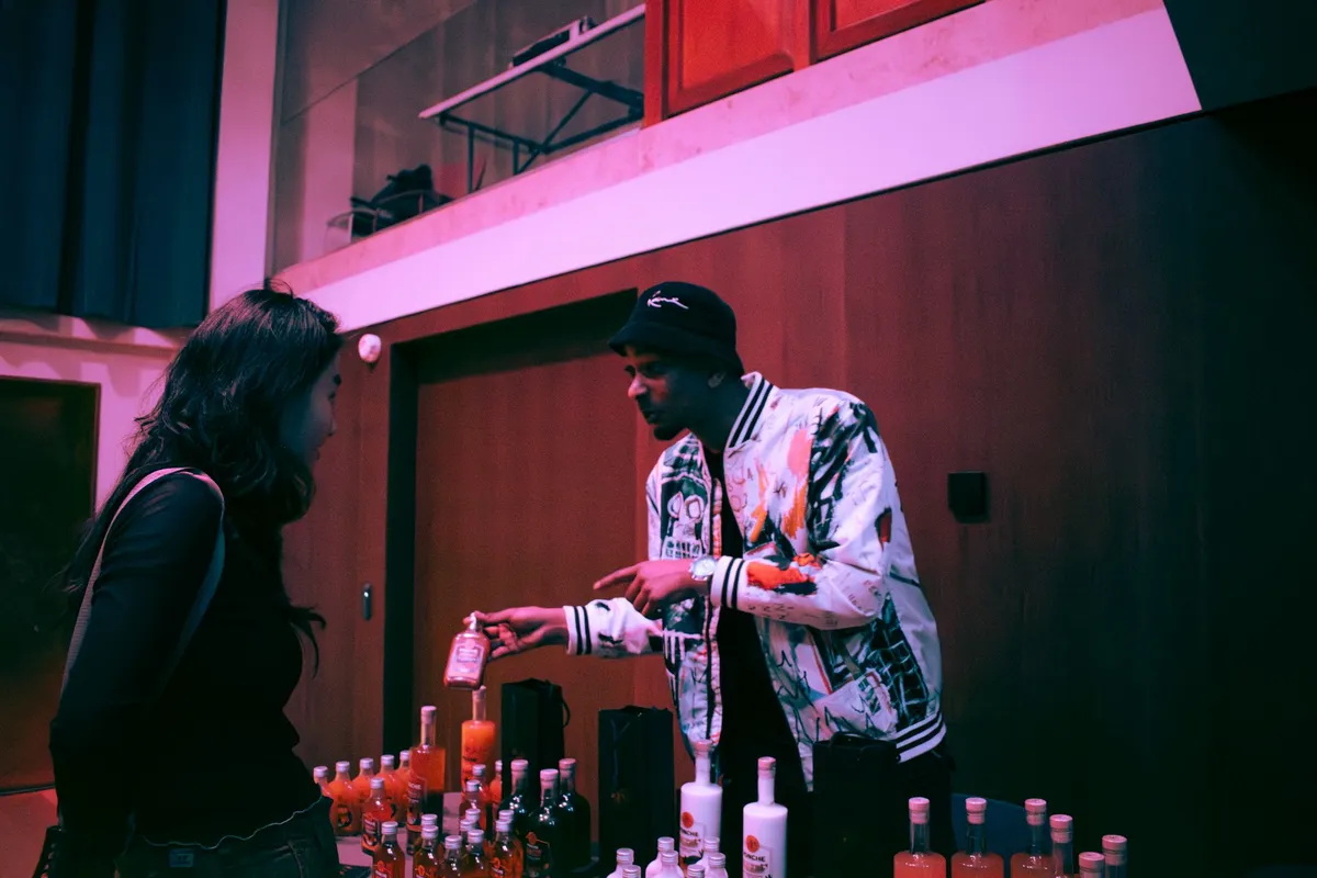 In het auditorium staat Stadium Status met hun collectie die is geïnspireerd door de 90s, kleurrijke kunst en grand architecture. Maar inspiratie vinden de makers ook op onverwachte plekken, zoals in de tekeningen van hun kinderen. Daarnaast is een tafel van Ponche Deliciouss, die Kaapverdische likeur maakt. Het familiebedrijf maakt het mogelijk om in Rotterdam ook de Kaapverdische drank te kunnen proeven in de originele honingsmaak, of een van de zeven andere smaken.