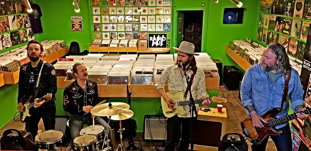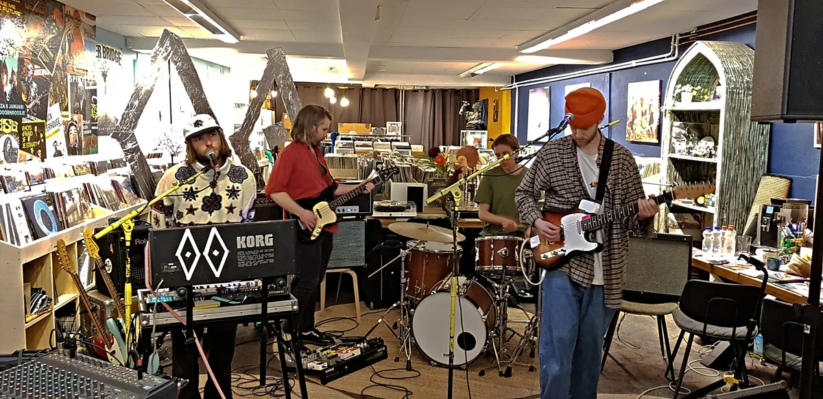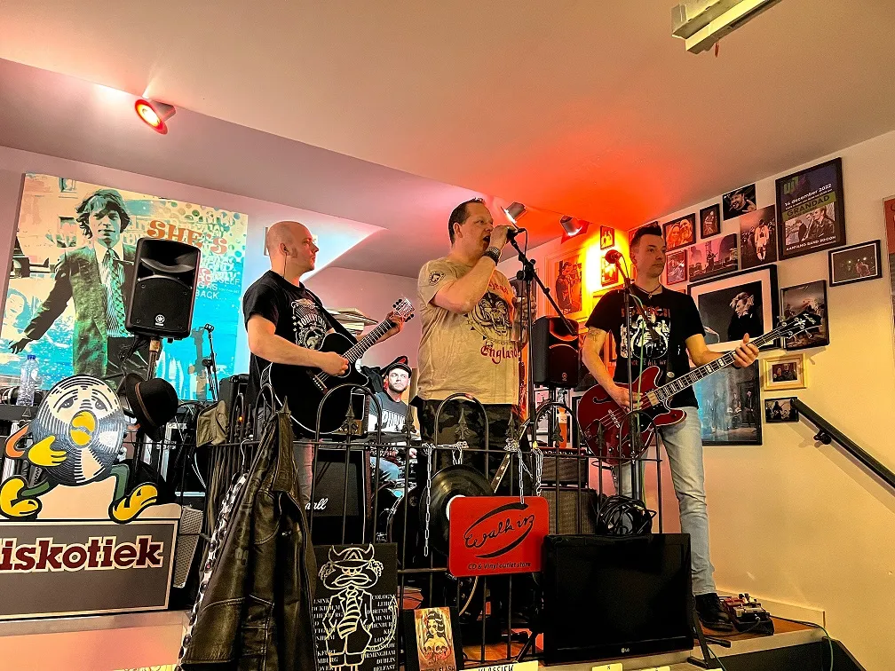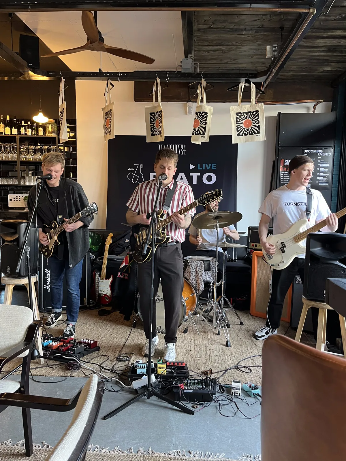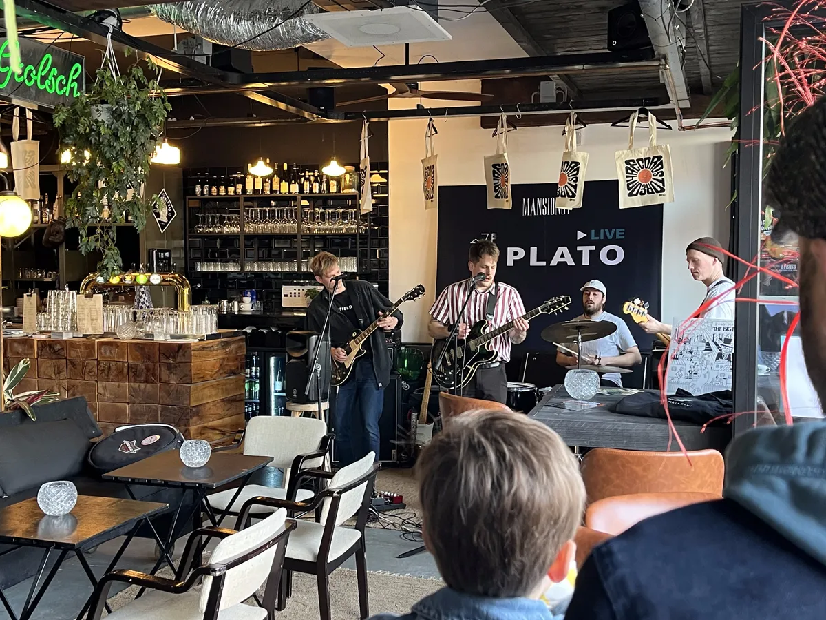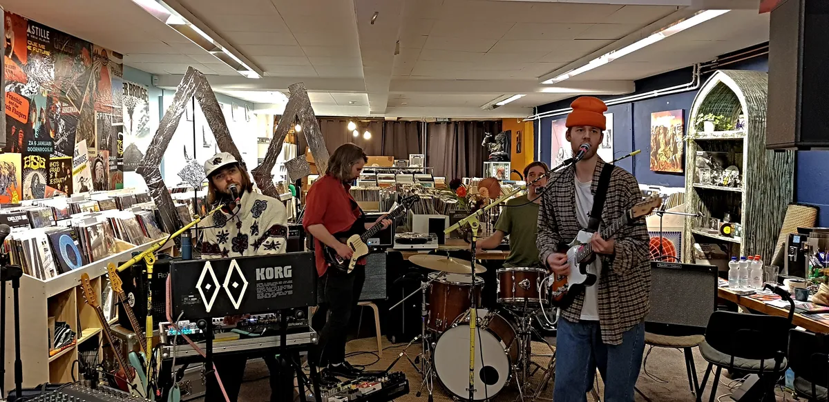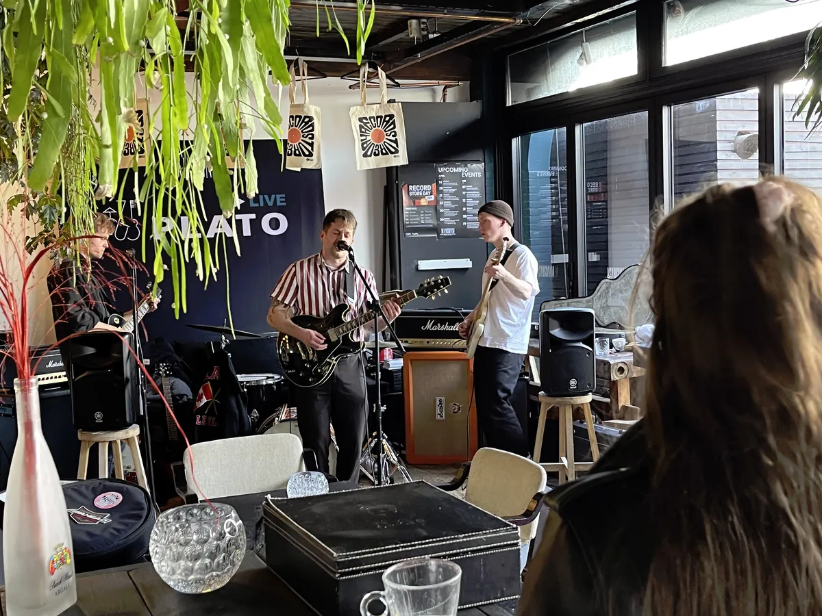 Nadat de Record Store Day-releases de eerste twee openingsuren al grondig zijn doorzocht, is het tijd voor het viertal Bony Macaroni uit Nunspeet/Ermelo om op te treden. Aangezien Plato Apeldoorn - gevestigd in Mansion24 - ook een café heeft, nemen de klanten na hun aankopen hier plaats om de eerste instore te beluisteren. De band heeft vorige maand zijn debuutplaat The Big Bucks uitgebracht en dus hebben de mannen er zin in. De glazen puien worden opengeschoven en meerdere versterkers worden aangesloten; Goedemorgen Apeldoorn, Record Store Day 2023 is begonnen.
