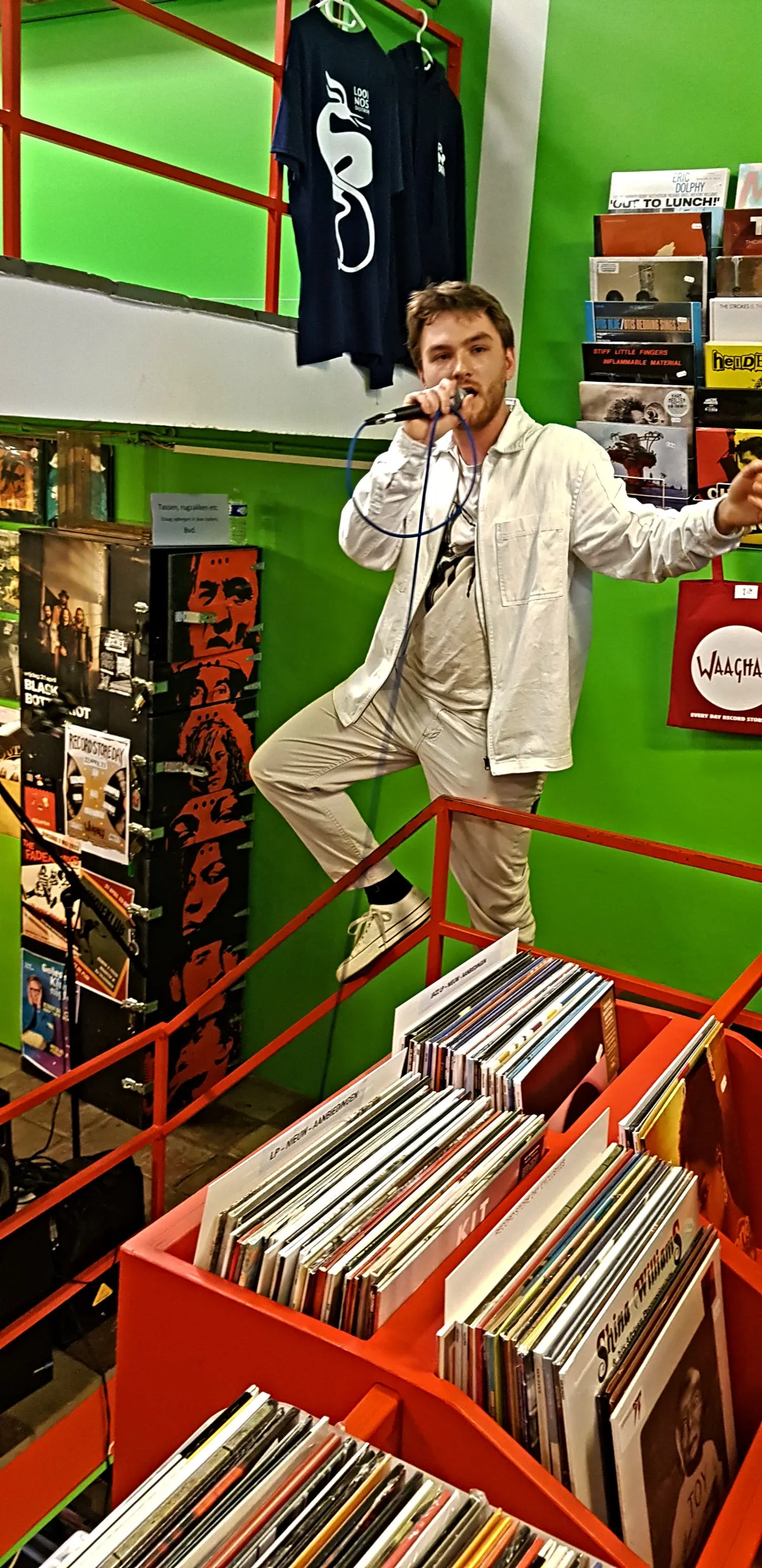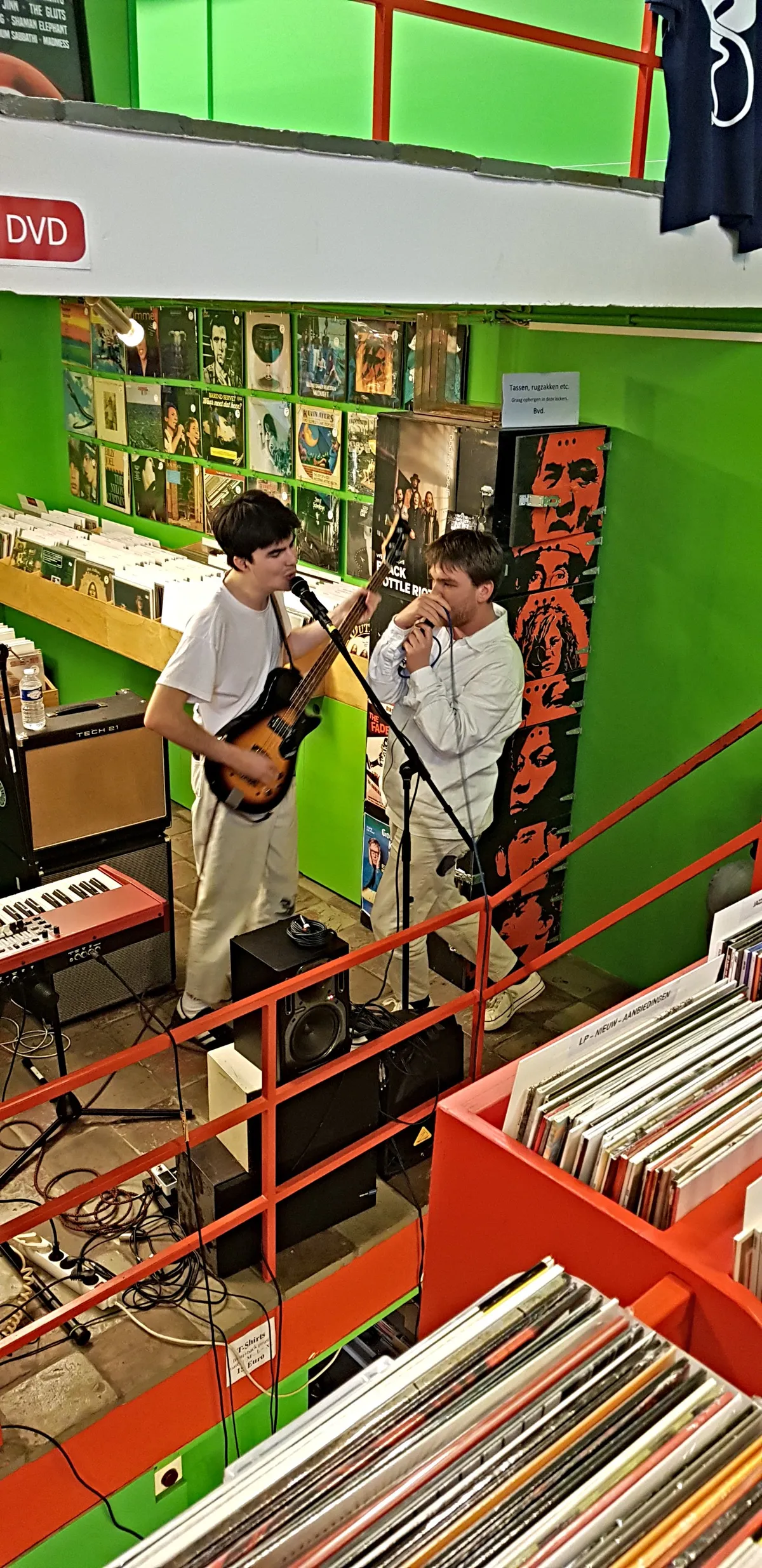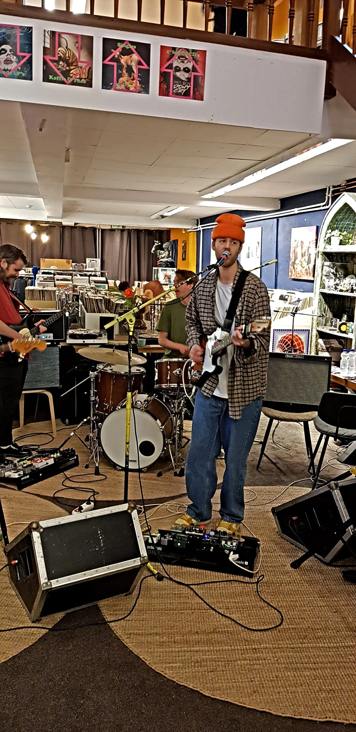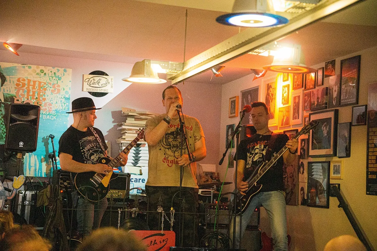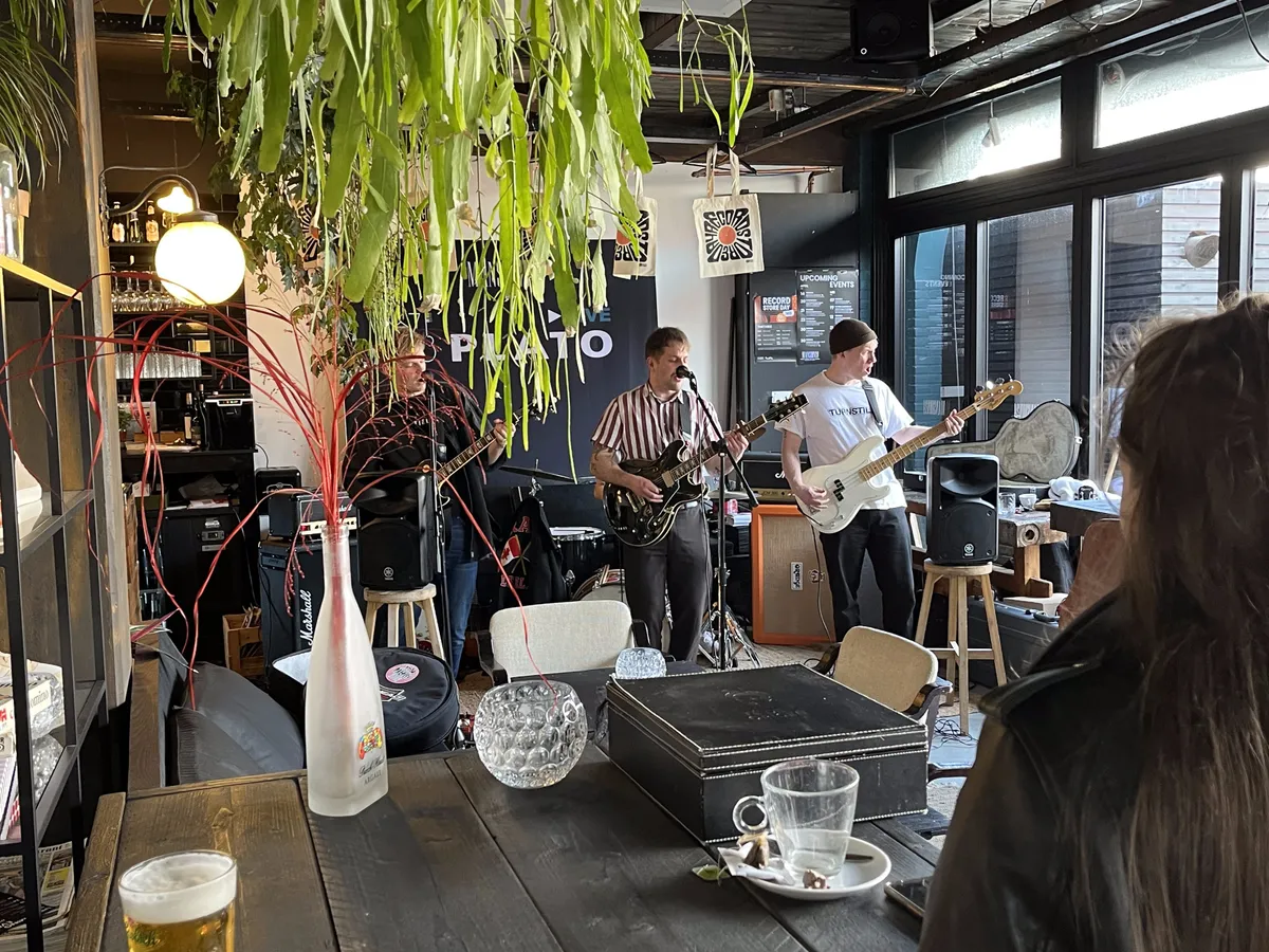 Nadat de Record Store Day-releases de eerste twee openingsuren al grondig zijn doorzocht, is het tijd voor het viertal Bony Macaroni uit Nunspeet/Ermelo om op te treden. Aangezien Plato Apeldoorn - gevestigd in Mansion24 - ook een café heeft, nemen de klanten na hun aankopen hier plaats om de eerste instore te beluisteren. De band heeft vorige maand zijn debuutplaat The Big Bucks uitgebracht en dus hebben de mannen er zin in. De glazen puien worden opengeschoven en meerdere versterkers worden aangesloten; Goedemorgen Apeldoorn, Record Store Day 2023 is begonnen.