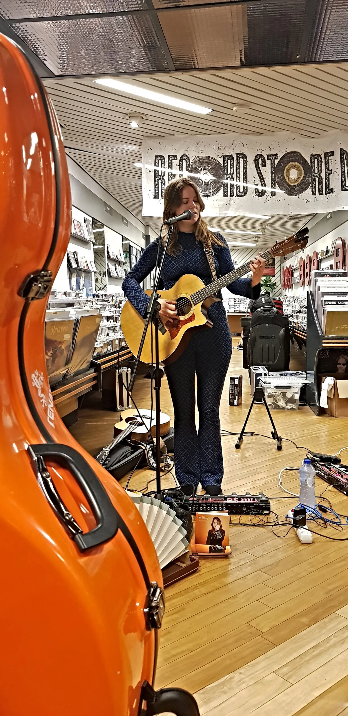 Wanneer de klok 16:30 uur aantikt, is het tijd voor Thijs van der Meulen uit Ermelo, beter bekend als Roofman. In zijn eentje staat Roofman met een akoestische gitaar om zijn nek voor het publiek. Het is inmiddels nog harder gaan regenen, maar desondanks zorgt ook zijn indiefolk voor een gezellige sfeer. In nummers als ‘Fly Off, Fall Down, Come Back’ en ‘That’s How Friends Become Strangers’ hoor je verre invloeden van het Amerikaanse duo The Lumineers. Het publiek geniet zichtbaar van zijn zang en gitaarspel en roept hem op nog meer nummers te spelen. Thijs moet er om lachen en zegt: “Ik doe een toegift en dat had ik niet verwacht”. Zijn woorden staan symbool voor de geslaagde dag die Record Store Day 2023 in Apeldoorn is. (Teun)