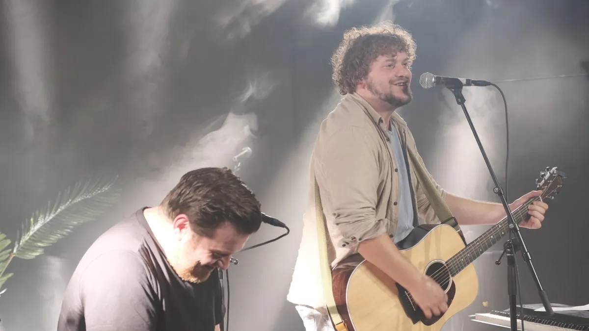 Hij staat al op het podium als we de zaal binnenkomen. Voor het eerste lied dat hij gaat doen heeft hij z’n gitaar gepakt en na een korte groet richting het publiek begint hij aan “Tussen twijfel & tijd”. Als hij hiermee klaar is heet hij het publiek van harte welkom. Ook zijn compagnon Levy IJtsma komt het podium op. Levy begeleid Jason op een Cajón, een soort handtrommel waar hij bovenop zit. Samen spelen ze enkele nummers als Beter dan dit en Ik keek om te zien of jij keek. Tegen het einde van het optreden vraagt hij ook het publiek om mee te doen in wat hij zelf noemt “publiek participatie”. Dat bestaat uit op het ritme meeklappen of met de voeten stampen. In het laatste lied dat hij als toegift geeft doet hij het publiek zelfs een fonetisch solo voor die het hele publiek gehoorzaam nazingt.