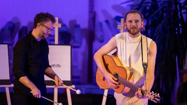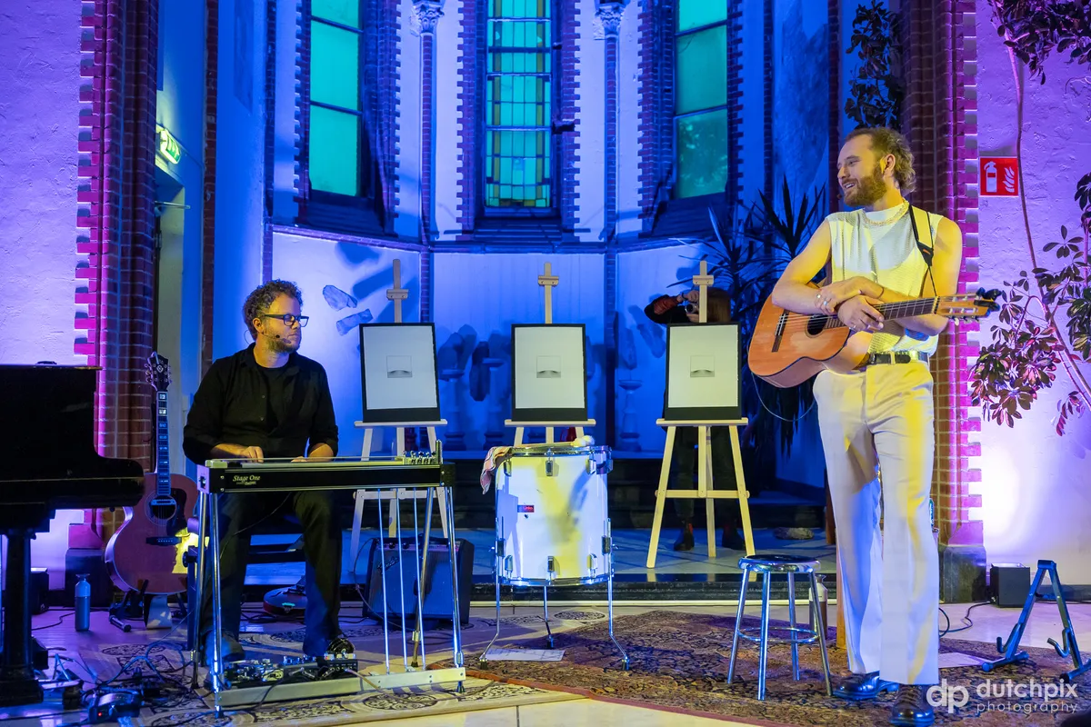 Het grootste gedeelte van de muziek die het duo maakt is lichtvoetig en ingetogen, maar als single ‘Kleine Duivel’ wordt ingezet mogen de voetjes iets sneller in de maat tikken (iedereen zit immers nog wel op de stoelen in de kapel). Het nummer, dat nostalgische herinneringen afzet tegen overdenkingen ten opzichte van de toekomst, behoort ook tot een van de hoogtepunten in de, al sterke, set van de middag. Een ander moment dat opvalt is wanneer de band een naar eigen zeggen “prachtig nummer” speelt. Aangezien het niet door henzelf is geschreven, mag Jesse dit van zichzelf zo zeggen, lacht de zanger. Wat volgt is een vrij letterlijke, ingetogen hertaling van Bruce Springsteens ‘Dancing In The Dark’ (nu: ‘Dansen Op De Tast’). Ook dit moment beklijft.