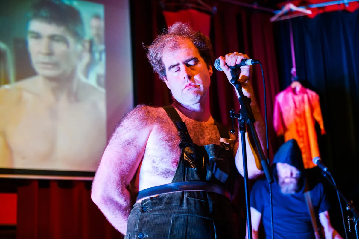 We hebben nog net tijd om even een frisse neus te halen in de fraaie binnentuin van de Vorst, voor we ons weer naar de reeds eerder genoemde Rode Zaal kunnen begeven voor de set van het Rotterdamse Buurtbeheer. Die naam zegt u misschien niet zoveel, maar frontman Jacco Weener is geen onbekende voor iedereen die enigszins thuis is in de Rotterdamse underground. Voor deze gelegenheid heeft de ruimschoots met lichaamshaar bedeelde Jacco zich uitgedost in een lederachtig werkpak, wat in combinatie met de panty over het hoofd van de drumster een zekere fetisj-indruk achterlaat. Eerder zagen we hem al eens een aanschouwelijk mini-college over de calvinistische levensopvatting geven, maar deze keer gooit hij het tekstueel over een andere boeg, en wordt het weinig florissante leven van het huurwoningproletariaat in schrille, maar tegelijkertijd bevreemdend humoristische kleuren geschetst (een type humor dat we gerust een handelsmerk van Jacco mogen noemen). Op de achtergrond zien we beelden van rellen en politie-invallen, terwijl drumster en bassist een meedogenloze geluidsmuur optrekken waarover Jacco zijn pakkende teksten (“slecht, maar terecht”) uitspuwt. Niet ieders ‘cup of tea’, deze linkse directe uit Rotterdam: we hebben een stuk meer bewegingsruimte dan bij het voorafgaande optreden, en van de aanwezigen houdt een aantal het na enige tijd voor gezien. Wie echter het geduld en uithoudingsvermogen heeft om zich onder te dompelen in de kille, maar ook wonderlijke wereld van Weener, is een bijzondere ervaring rijker.
