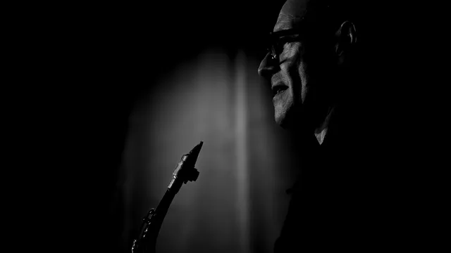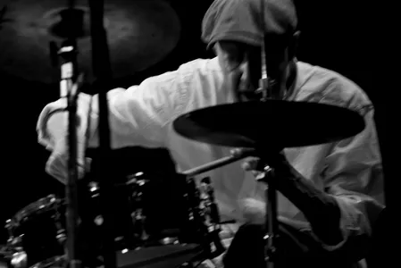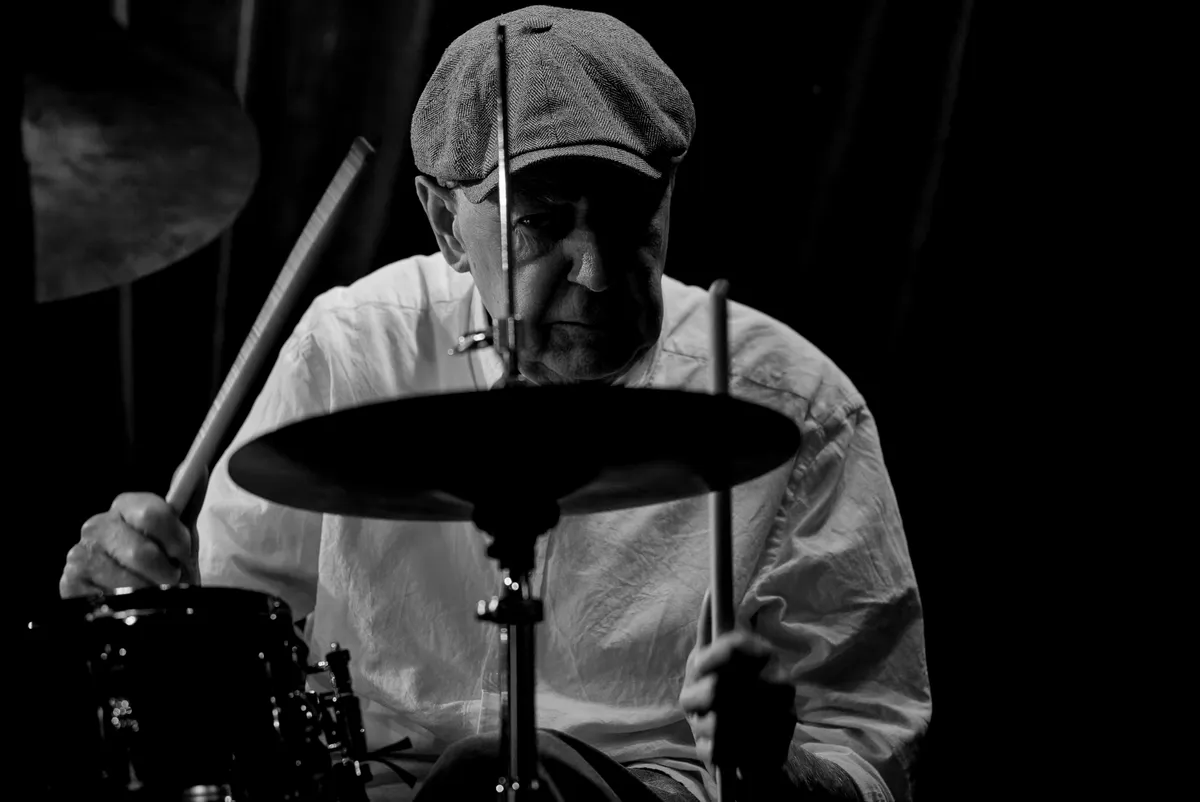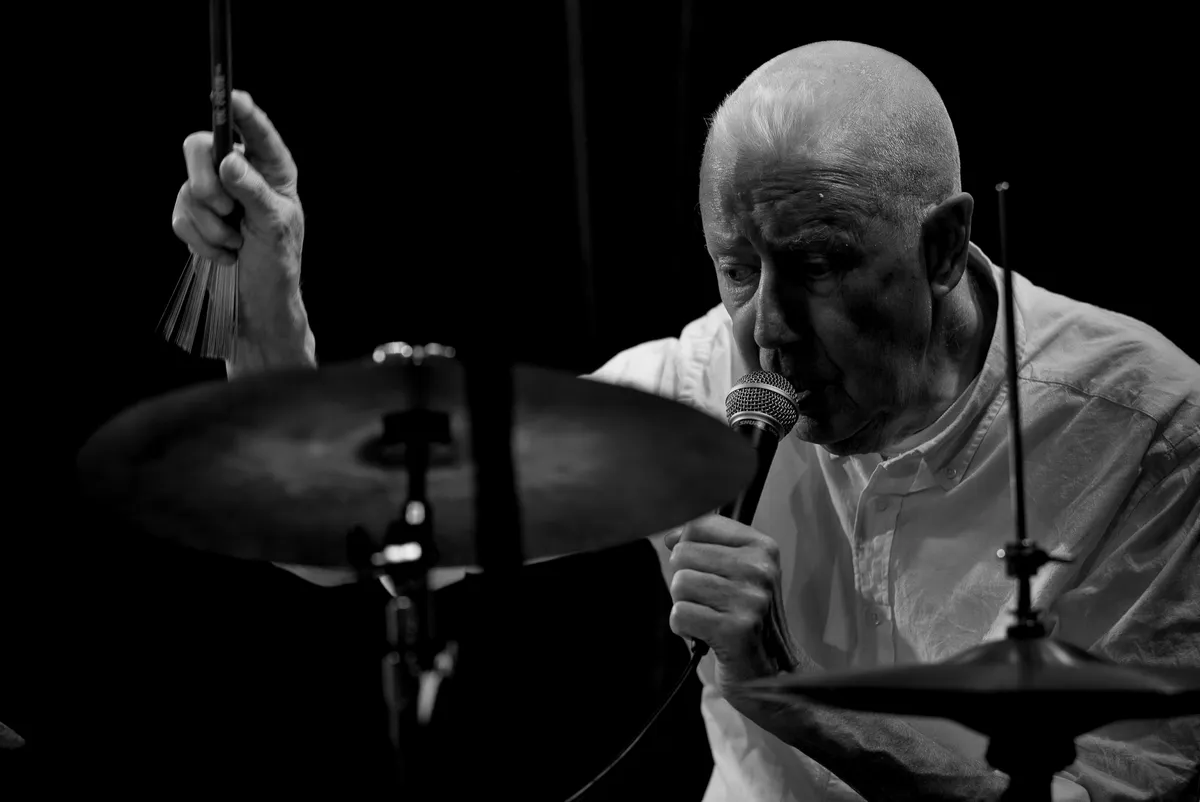 Terwijl Benjamin Herman en Ernst Glerum nog staan te wikken waar hun muziekstandaard het beste kan staan, zit Han Bennink al te tikken op zijn drumstel. Hij kan niet wachten... Alles wat Han doet is ritme: een harde knal op de snare, aaien over de bekkens of wrijven over het drumvel met z'n vingertoppen, alles springt en beweegt ritmisch.