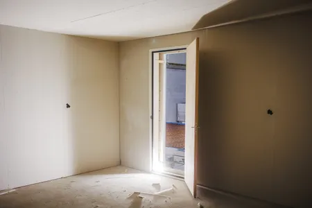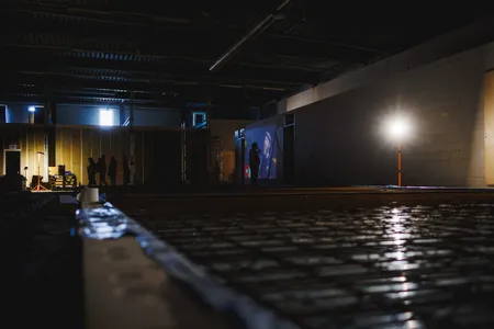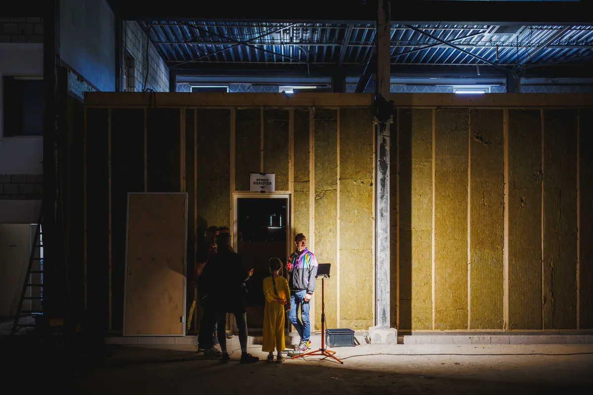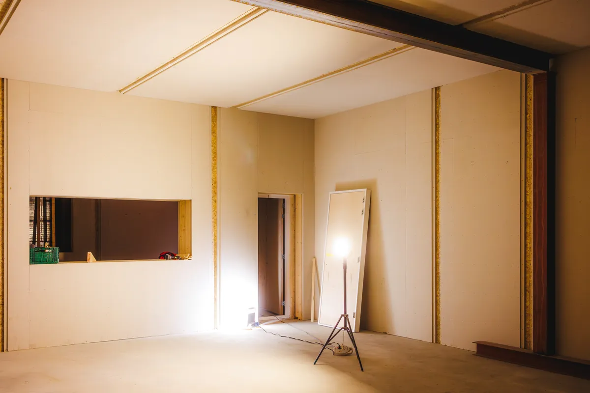 In de achterste grote ruimte zijn tegen de verste muur al vier oefenruimtes opgebouwd. Ook de ruimtes waar Studio Moskou en Studio Silvester straks hun plek krijgen, hebben inmiddels al wanden en een deur. “Beneden komen in totaal 17 oefenruimtes”, licht eigenaar Paul de Brabander toe. “Komende week storten we de vloer voor de volgende oefenruimtes en gaan we de panelen voor die ruimtes plaatsen. Op de eerste verdieping komen meer gevarieerde studio’s, bijvoorbeeld voor muziekschool Backstage of voor makers die er langer willen zitten.”