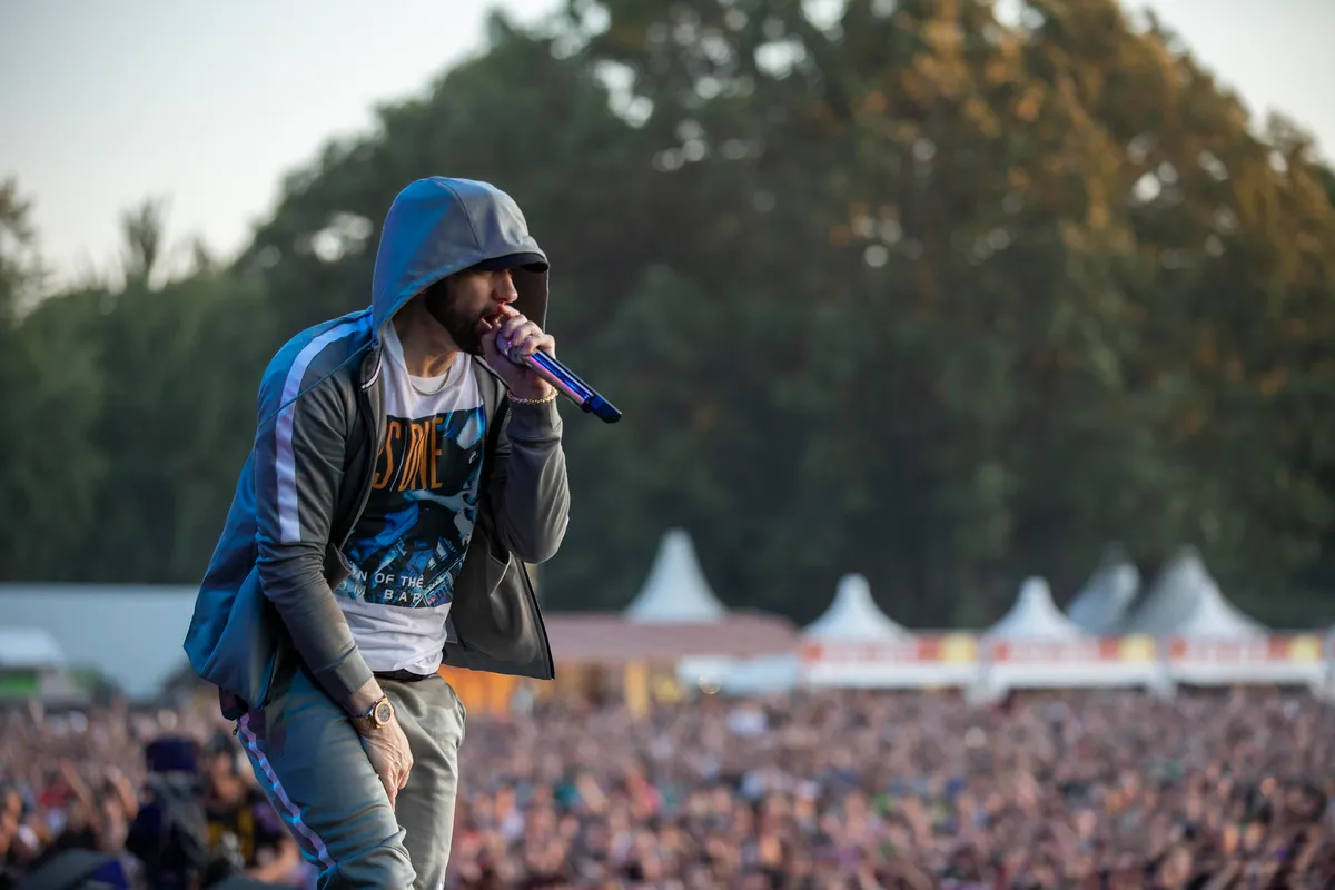 Je zou niet zeggen dat Eminem al 45 jaar oud is. Zijn haar is niet meer blond, maar ondanks zijn roerige verleden ziet hij er nog verdacht hetzelfde uit als pakweg 20 jaar geleden. Met een simpel grijs trainingspak aan en petje op betreedt hij het podium. Daar is even van tevoren het witte doek omhoog gehesen om een band met strijkers, gitaristen, achtergrondzangeres, drummers en een beat producer te onthullen. De boodschap is duidelijk: vanavond draait het om de muziek.